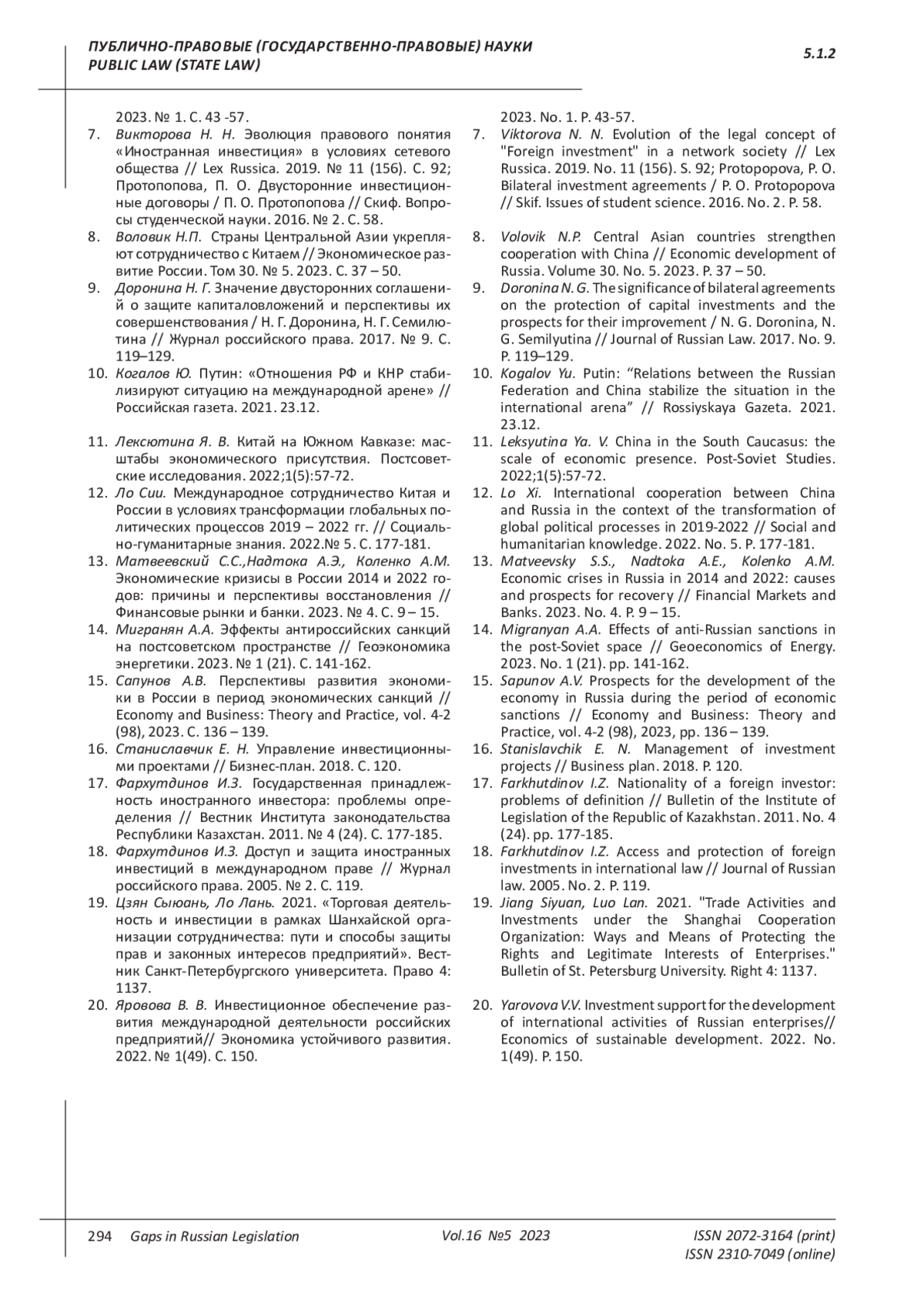19. Цзян Сыюань, Ло Лань. 2021. “Торговая деятельность и инвестиции в рамках Шанхайской организации сотрудничества: пути и способы защиты прав и законных интересов предприятий”. Вестник Санкт-Петербургского университета. Право 4: 1137.