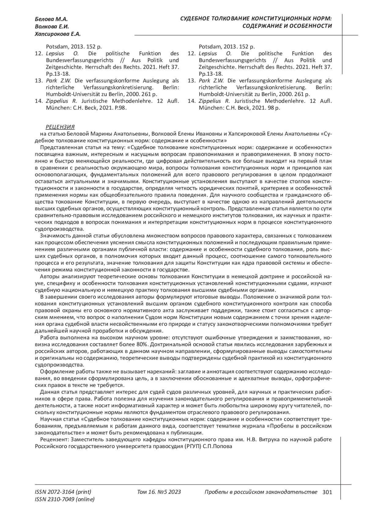 12. Lepsius O. Die politische Funktion des Bundesverfassungsgerichts // Aus Politik und Zeitgeschichte. Herrschaft des Rechts. 2021. Heft 37. Pp.13-18.