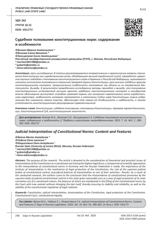Chervonyuk V.I., Saudakhanov M.V. Interpretation of the Constitution and constitutional hermeneutics // International Journal of Constitutional and State Law. 2018. № 4.