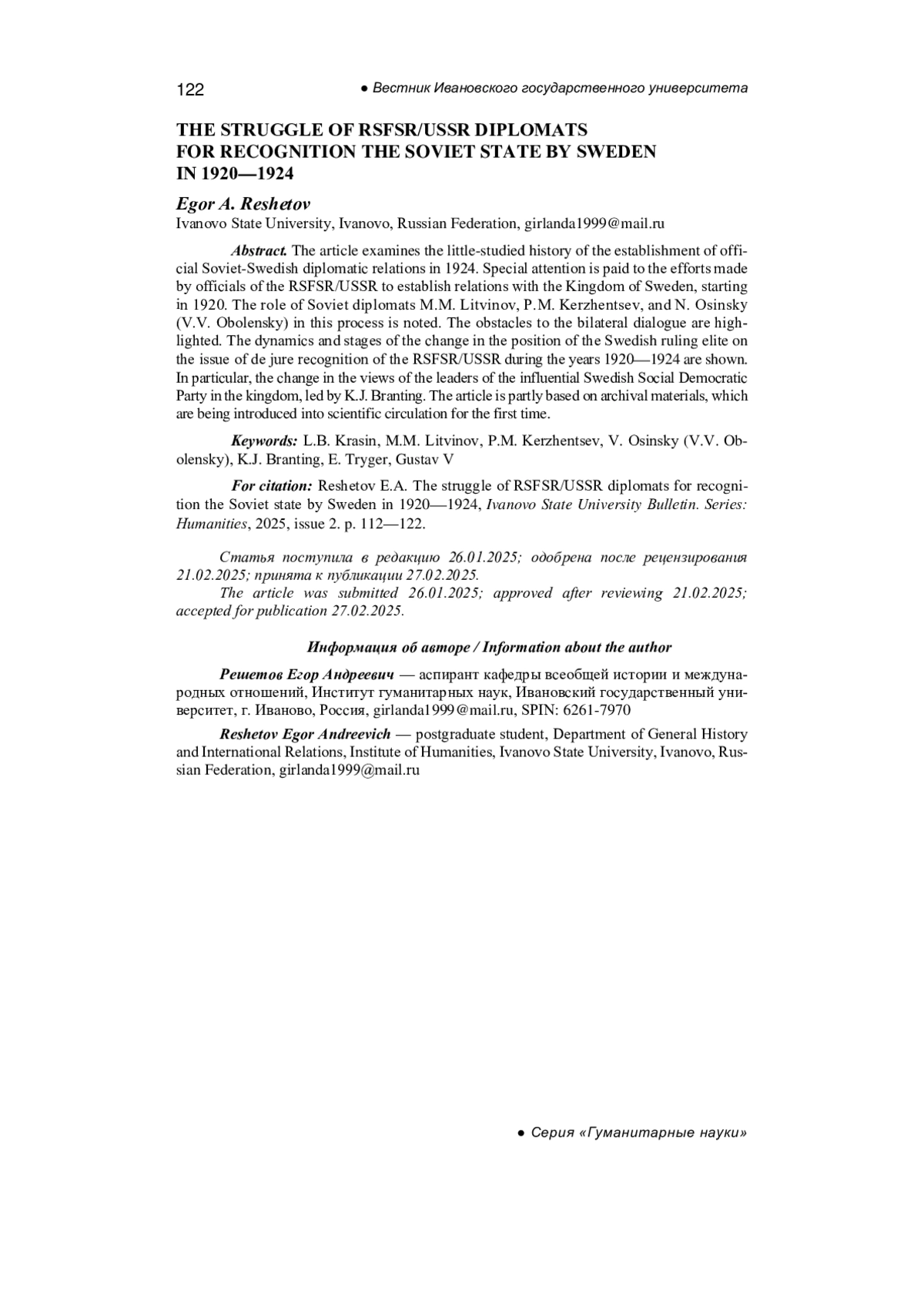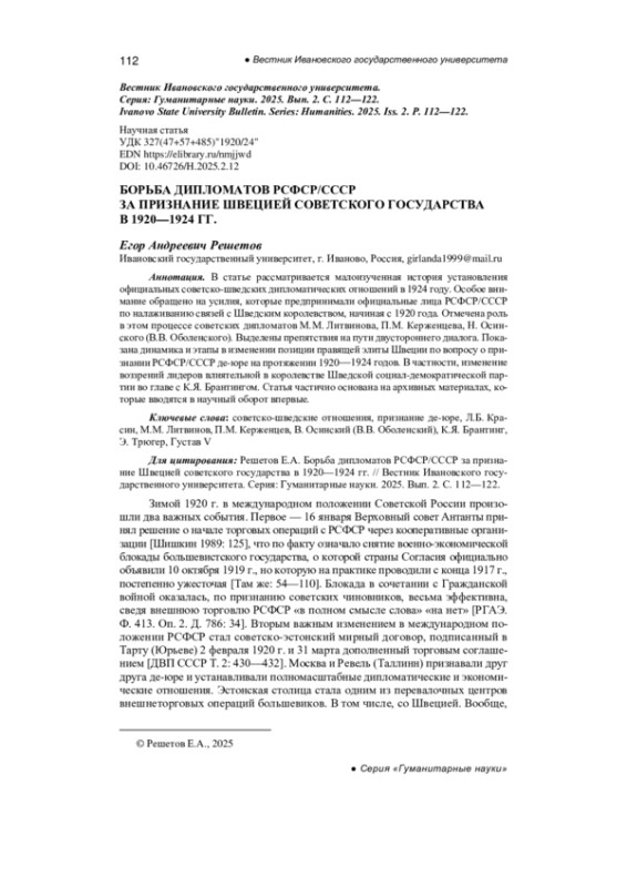 12. Черноперов В.Л., Решетов Е.А. Из истории советско-шведских военных связей в 1920-м - 1930-е годы // Вестник Брянского государственного университета. 2024. № 3. С. 110-124. EDN: PRGFBZ