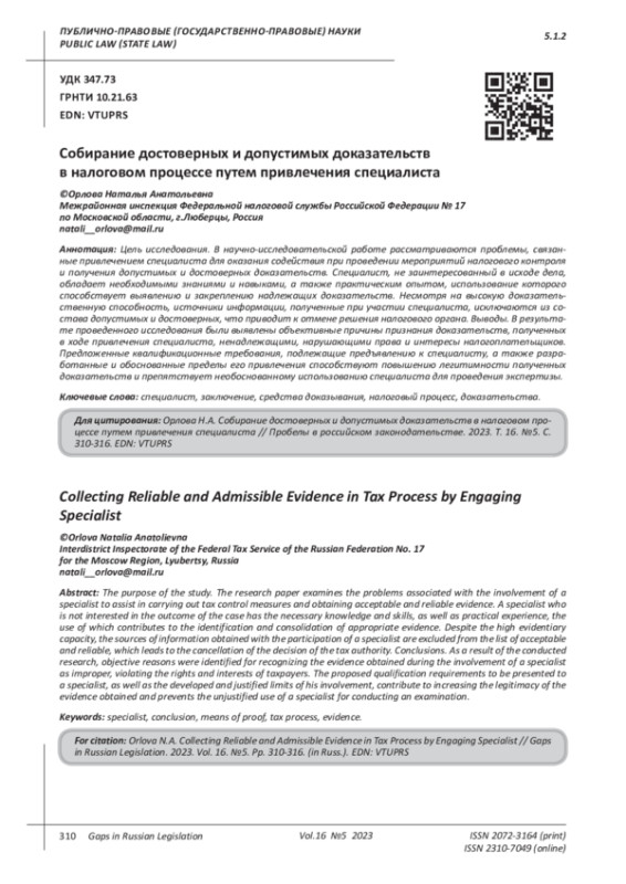 Цель исследования. В научно-исследовательской работе рассматриваются проблемы, связанные привлечением специалиста для оказания содействия при проведении мероприятий налогового контроля и получения допустимых и достоверных доказательств. Специалист, не заинтересованный в исходе дела, обладает необходимыми знаниями и навыками, а также практическим опытом, использование которого способствует выявлению и закреплению надлежащих доказательств. Несмотря на высокую доказательственную способность, источники информации, полученные при участии специалиста, исключаются из состава допустимых и достоверных, что приводит к отмене решения налогового органа. Выводы. В результате проведенного исследования были выявлены объективные причины признания доказательств, полученных в ходе привлечения специалиста, ненадлежащими, нарушающими права и интересы налогоплательщиков. Предложенные квалификационные требования, подлежащие предъявлению к специалисту, а также разработанные и обоснованные пределы его привлечения способствуют повышению легитимности полученных доказательств и препятствует необоснованному использованию специалиста для проведения экспертизы.