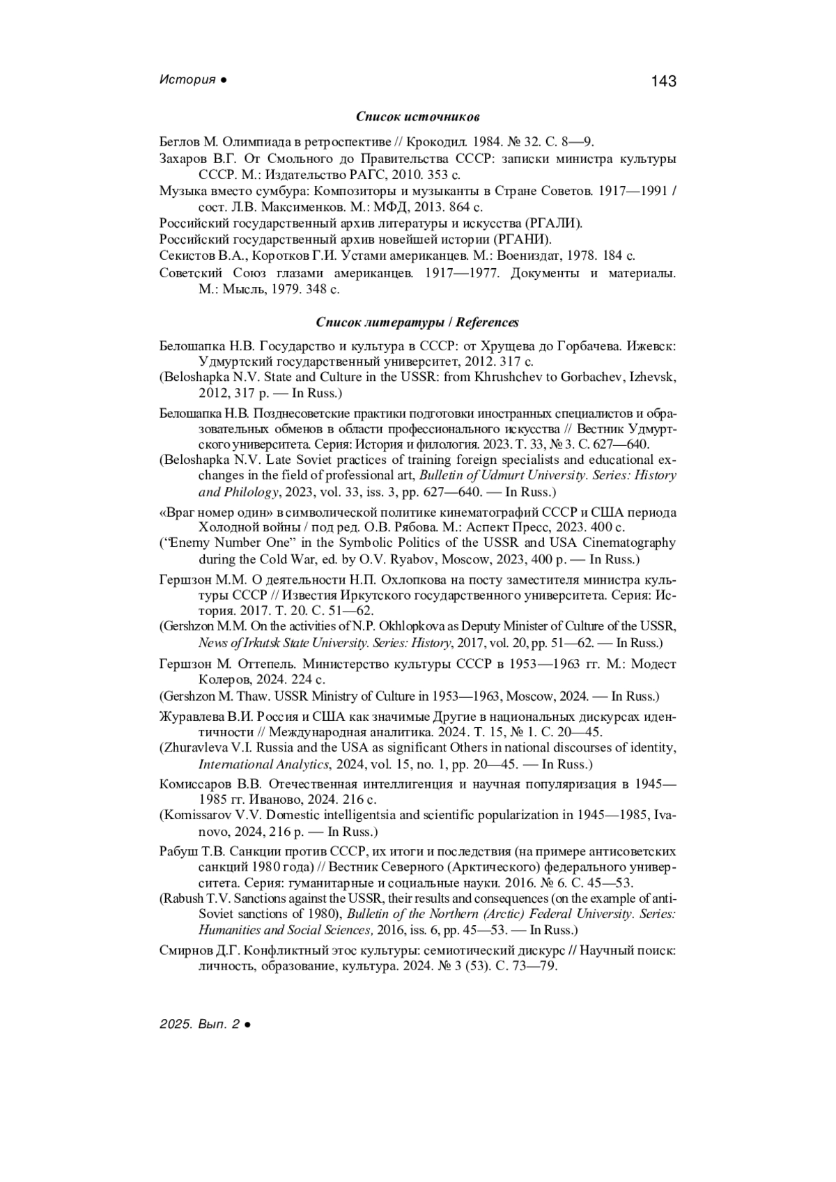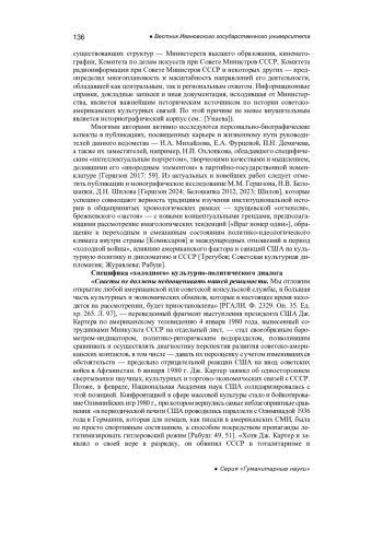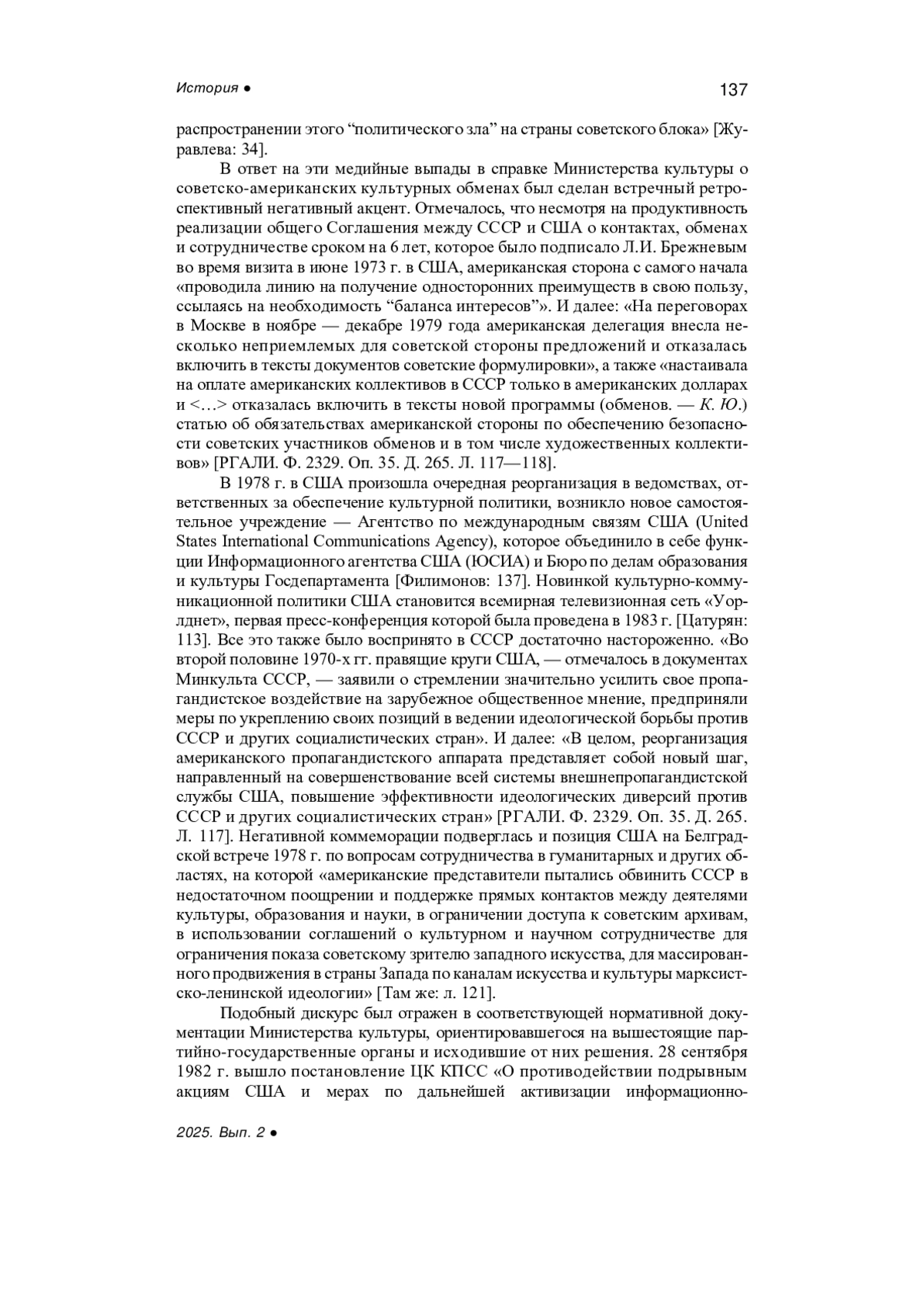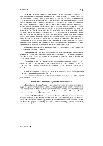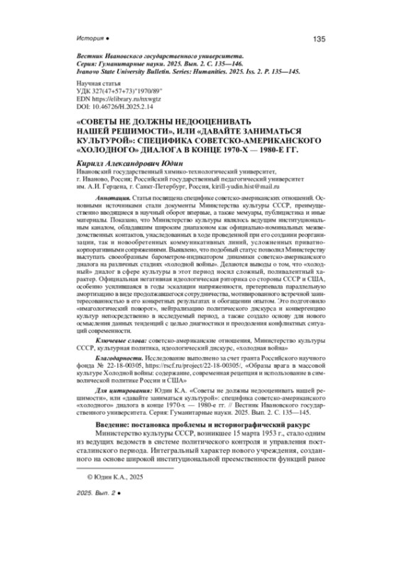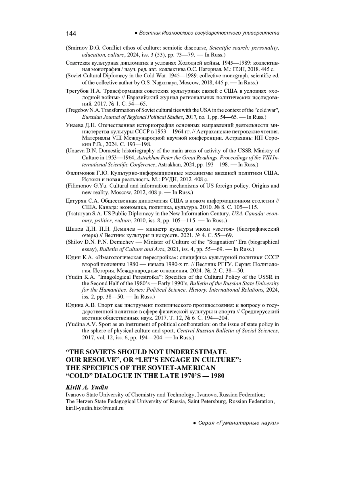 ЮДИН К. А. «СОВЕТЫ НЕ ДОЛЖНЫ НЕДООЦЕНИВАТЬ НАШЕЙ РЕШИМОСТИ», ИЛИ «ДАВАЙТЕ ЗАНИМАТЬСЯ КУЛЬТУРОЙ»: СПЕЦИФИКА СОВЕТСКО-АМЕРИКАНСКОГО «ХОЛОДНОГО» ДИАЛОГА В КОНЦЕ 1970-Х - 1980-Е ГГ // ВЕСТНИК ИВАНОВСКОГО ГОСУДАРСТВЕННОГО УНИВЕРСИТЕТА. СЕРИЯ: ГУМАНИТАРНЫЕ НАУКИ. 2025. № 2