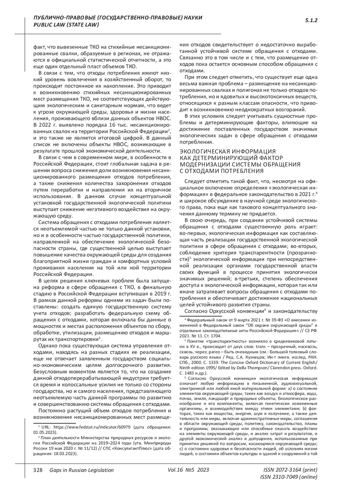 В статье показано значение экологической информации при принятии и реализации экологически значимых решений, осуществлении государственной политики в области обращения с отходами, а также достижении национальных целей устойчивого развития. Выделен признак транспарентности для обеспечения доступа к экологической информации и одного из основных критериев определения эффективности реализации государственной экологической политики в сфере обращения с отходами потребления.