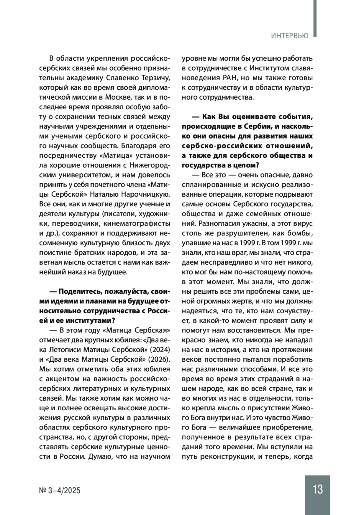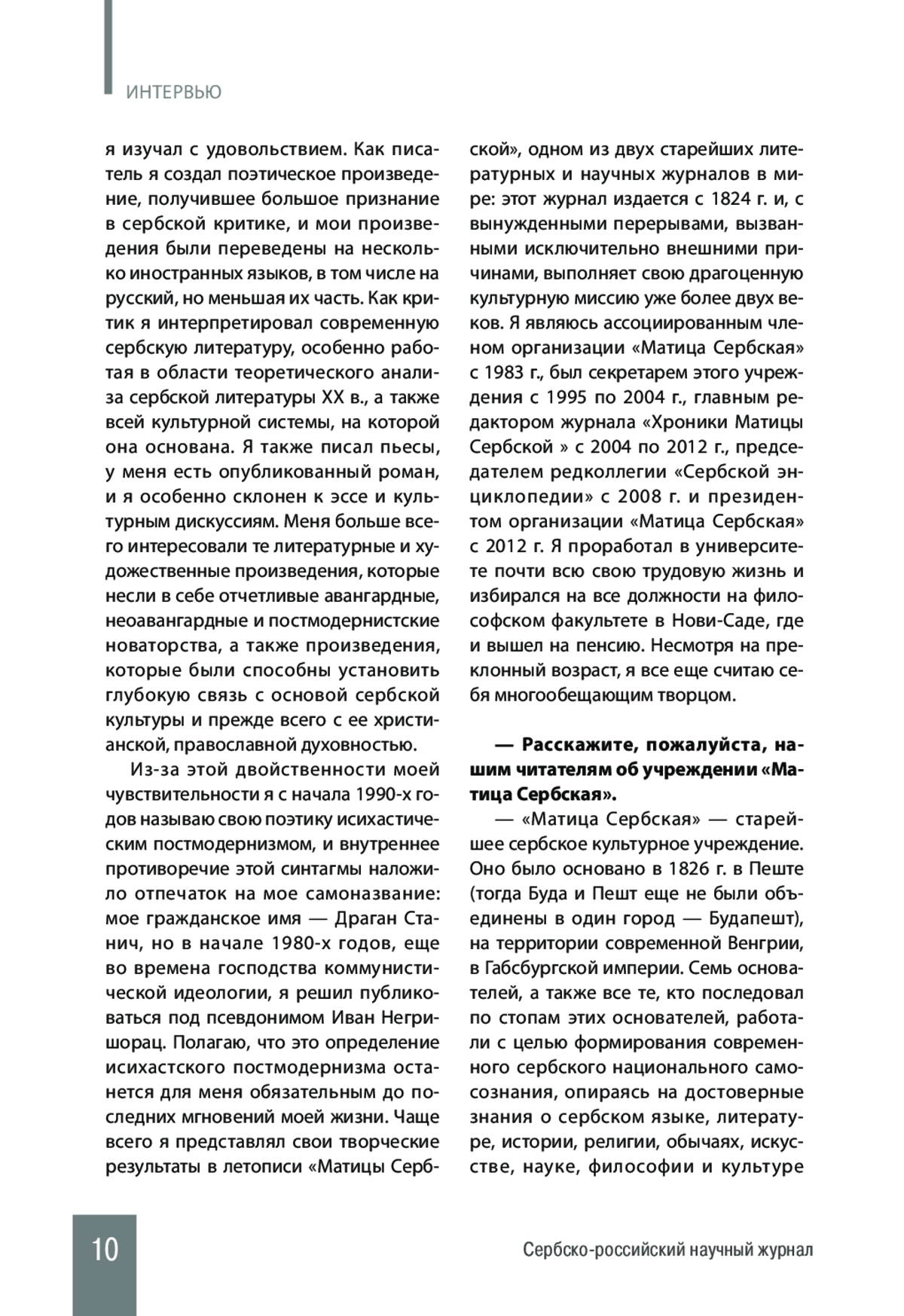 — Мой жизненный путь отмечен стремлением сохранить оба измерения своей деятельности — как литературно-художественное, так и литературно-научное. В этом смысле в сербской культуре я принадлежу к узкому кругу ярко выраженных «двоедушных людей», как их называл великий рассказчик, прозаик и историк литературы Милорад Павич.