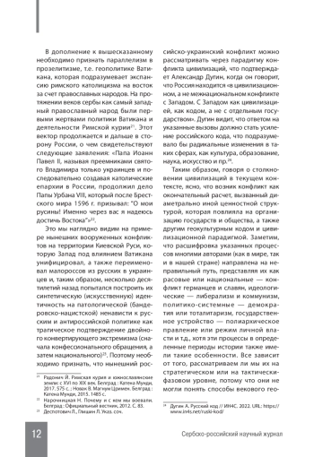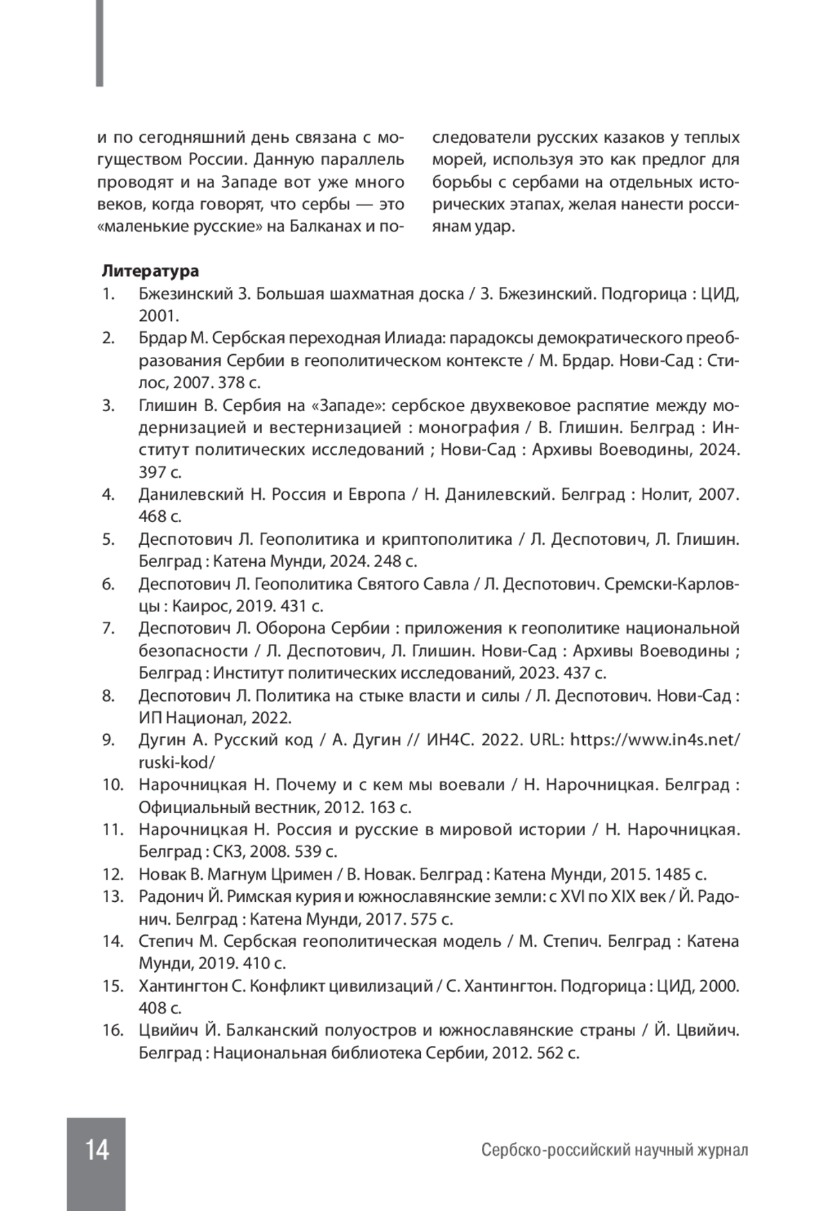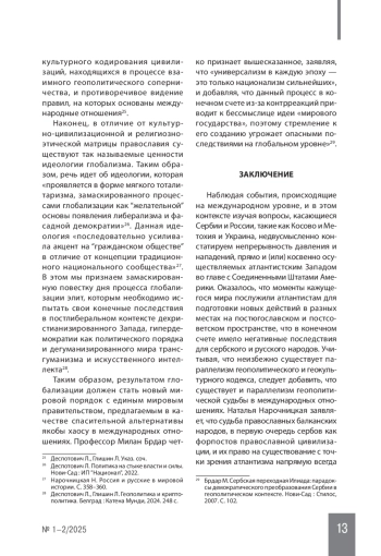 ГЛИШИН В., ДЕСПОТОВИЧ Л. СЕРБИЯ И РОССИЯ — ПАРАЛЛЕЛИЗМ ГЕОПОЛИТИЧЕСКОГО, РЕЛИГИОЗНОКОНФЕССИОНАЛЬНОГО И ГЕОКУЛЬТУРНОГО КОДА // СЕРБСКО-РОССИЙСКИЙ НАУЧНЫЙ ЖУРНАЛ. 2025. № 1-2