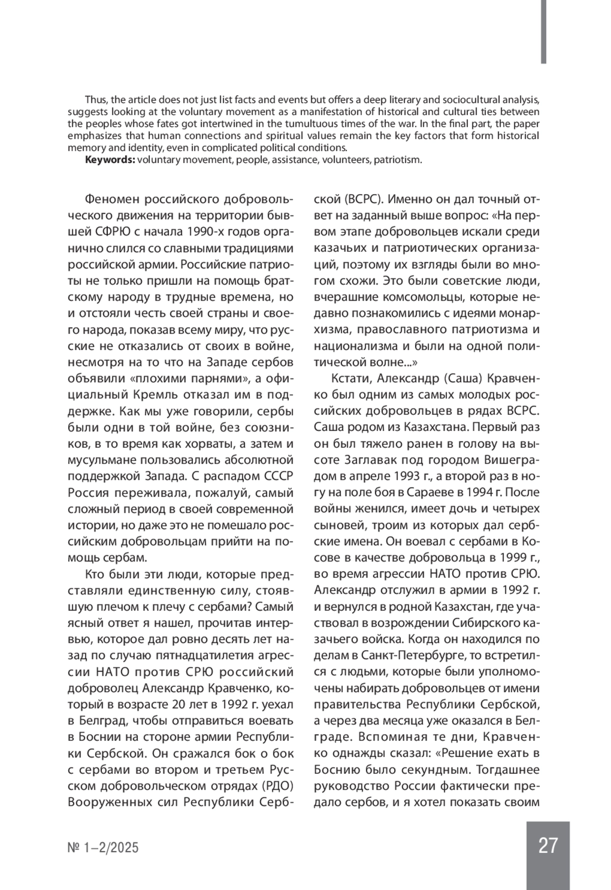 В статье рассматривается феномен российского добровольческого движения на территории бывшей Социалистической Федеративной Республики Югославия (СФРЮ) с начала 1990-х годов, акцентируя внимание на историко-культурной и патриотической значимости участия российских добровольцев в вооруженных конфликтах на стороне сербов. Основная мысль материала заключается в том, что, несмотря на международную изоляцию Сербии и негативное освещение ее действий в западной прессе, российские добровольцы откликнулись на призыв братского народа, что стало символом единства и солидарности между русским и сербским народами.