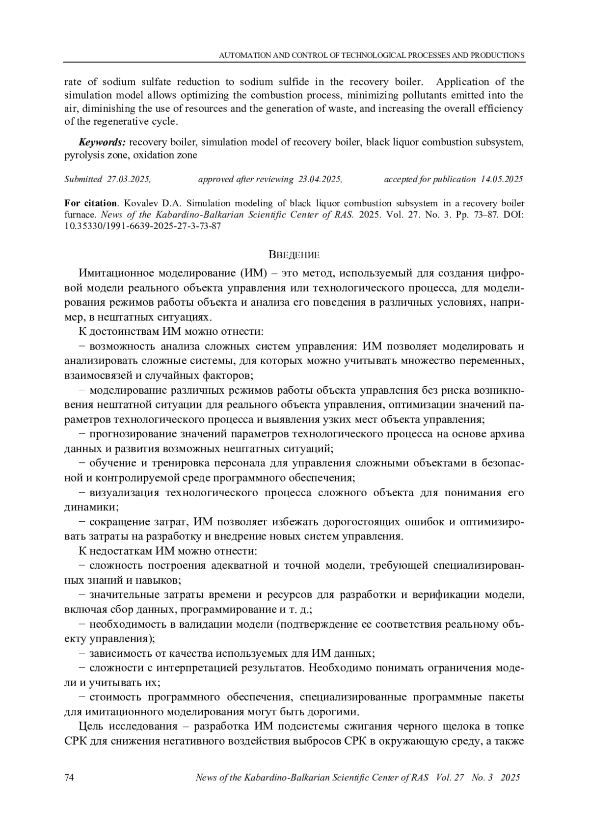 13. Ковалёв Д. А., Куркина В. В., Русинов Л. А. Моделирование степени восстановления сульфата натрия в плаве для процесса сжигания черного щелока в топке содорегенерационного котлоагрегата // Всероссийская научная конференция по проблемам управления в технических системах. 2023. Т. 1. С. 69-72. EDN: YWDMNH
