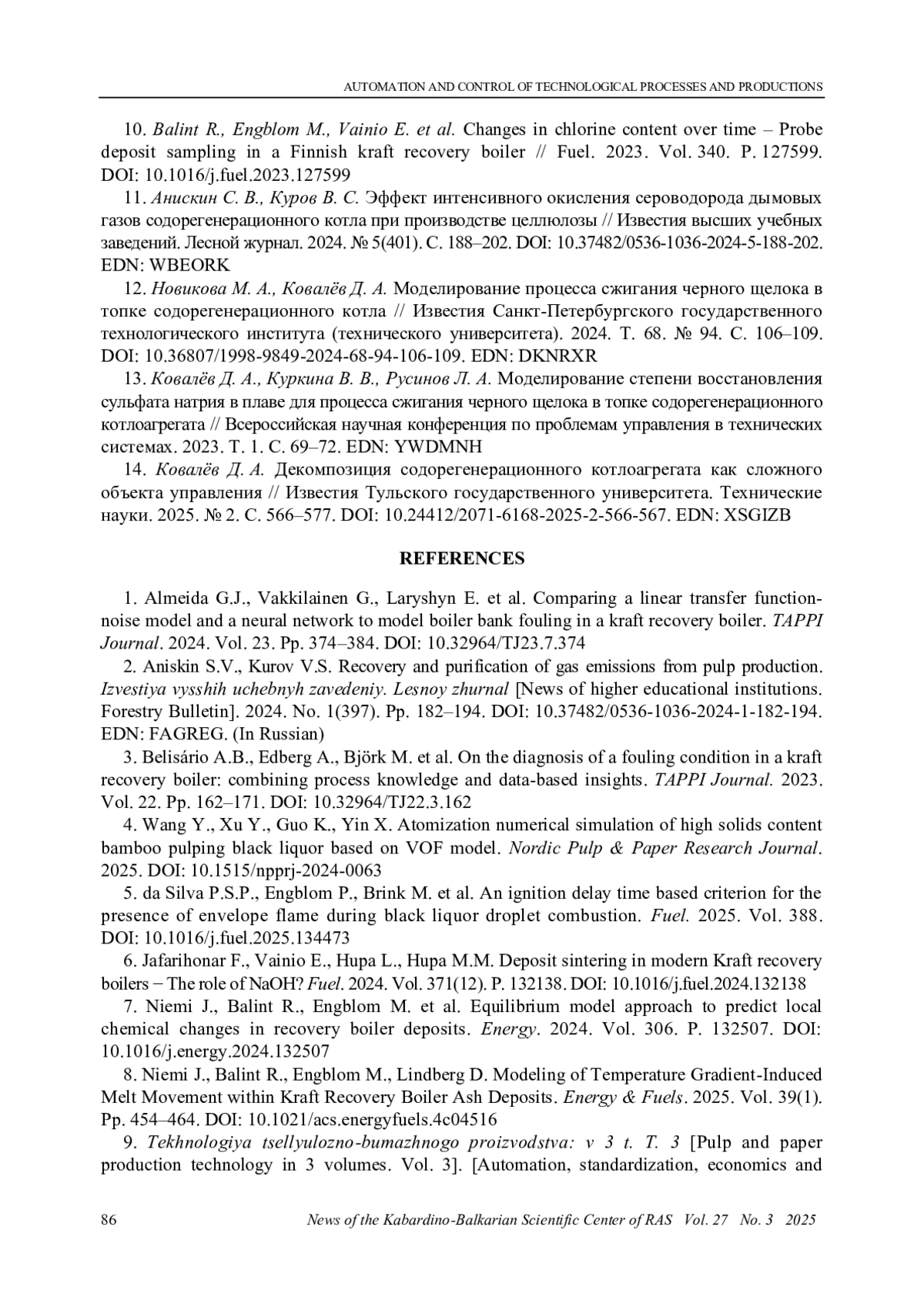 14. Ковалёв Д. А. Декомпозиция содорегенерационного котлоагрегата как сложного объекта управления // Известия Тульского государственного университета. Технические науки. 2025. № 2. С. 566-577. DOI: 10.24412/2071-6168-2025-2-566-567 EDN: XSGIZB