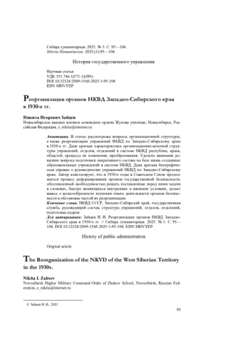 В статье рассмотрены вопросы организационной структуры, а также реорганизации управлений НКВД по Западно-Сибирскому краю в 1930-е гг. Дана краткая характеристика организационно-штатной структуры управлений, отделов, отделений в системе НКВД республик, краев, областей, процесса их изменения, преобразования. Уделено внимание решению вопроса подготовки оперативного состава на базе вновь созданных образовательных учреждений в системе НКВД. Дана краткая биографическая справка о руководителях управлений НКВД по Западно-Сибирскому краю. Автор констатирует, что в 1930-е годы в Советском Союзе продолжается процесс реформирования органов государственной безопасности, обусловленный необходимостью решать поставленные перед ними задачи в сложных, быстро меняющихся внутренних и внешних условиях, делает вывод о целесообразности изучения опыта деятельности органов безопасности в обстановке частой их реорганизации.