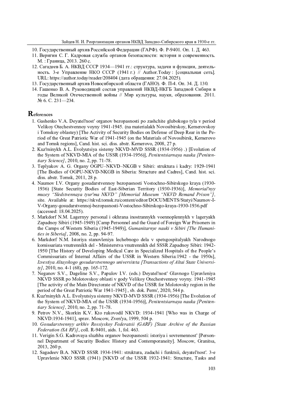 14. Гашенко B. A. Руководящий состав управлений НКВД-НКГБ Западной Сибири в годы Великой Отечественной войны // Мир культуры, науки, образования. 2011. № 6. С. 231—234.