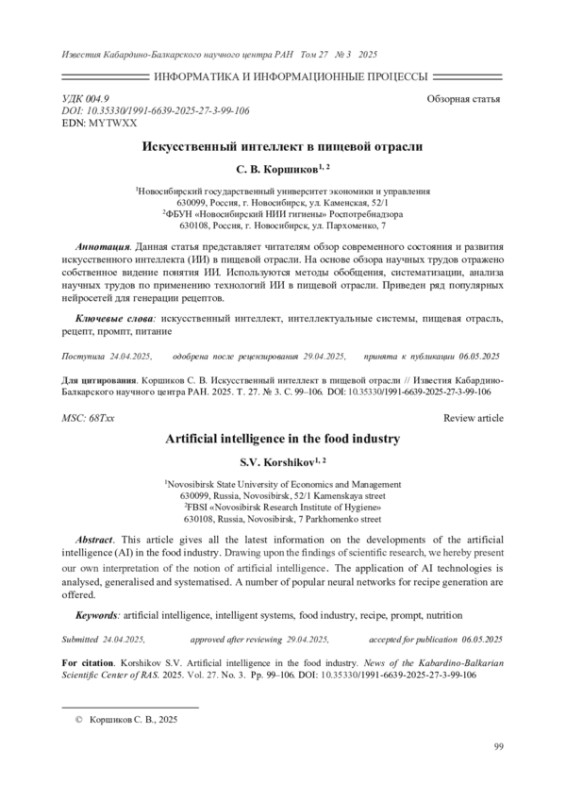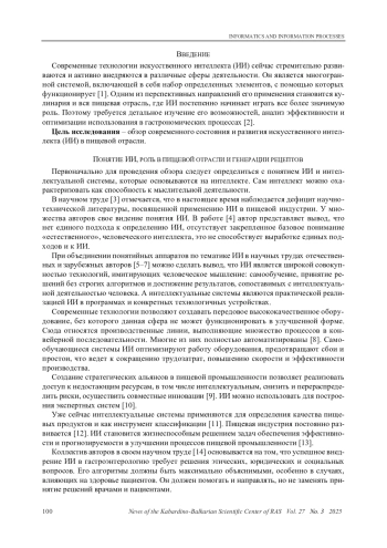 Данная статья представляет читателям обзор современного состояния и развития искусственного интеллекта (ИИ) в пищевой отрасли. На основе обзора научных трудов отражено собственное видение понятия ИИ. Используются методы обобщения, систематизации, анализа научных трудов по применению технологий ИИ в пищевой отрасли. Приведен ряд популярных нейросетей для генерации рецептов.