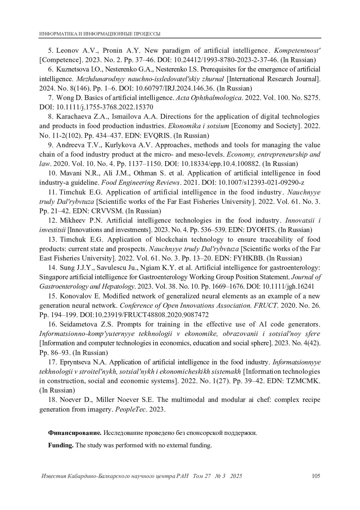 17. Епрынцева Н. А. Применение искусственного интеллекта в пищевой отрасли // Информационные технологии в строительных, социальных и экономических системах. 2022. № 1(27). С. 39-42. EDN: TZMCMK