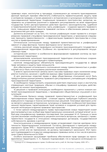 Анализируются различные доктринальные подходы к определению территориальных государственных изменений, выделяются их виды, а также рассматриваются основные цели, преследуемые государствами при их осуществлении. Особое внимание уделяется соотношению целей территориальных изменений с фундаментальными принципами международного права, такими как принцип территориальной целостности государств и право народов на самоопределение. Учитывая актуальность проблематики присоединения новых территорий в контексте современных международных отношений, акцент делается на правовой природе и специфических последствиях данного вида территориальных изменений. В статье отмечается, что присоединение новых территорий является сложным и многоаспектным процессом, имеющим значительные правовые последствия как для присоединяющего государства, так и для международного сообщества в целом. Присоединение новых территорий - это не только юридический акт, но и сложный социально-политический процесс, требующий от государств взвешенности, ответственности и приверженности принципам международного права. Только при соблюдении этих принципов присоединение может способствовать укреплению международной стабильности и сотрудничества. Подчеркивается важность соблюдения норм и принципов международного права, обеспечения прав и интересов населения присоединенных территорий, а также поддержания международного мира и безопасности.