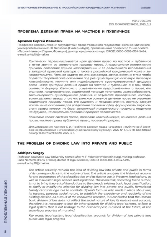 АРХИПОВ С. И. ПРОБЛЕМА ДЕЛЕНИЯ ПРАВА НА ЧАСТНОЕ И ПУБЛИЧНОЕ // ЭЛЕКТРОННОЕ ПРИЛОЖЕНИЕ К РОССИЙСКОМУ ЮРИДИЧЕСКОМУ ЖУРНАЛУ. 2025. № 3