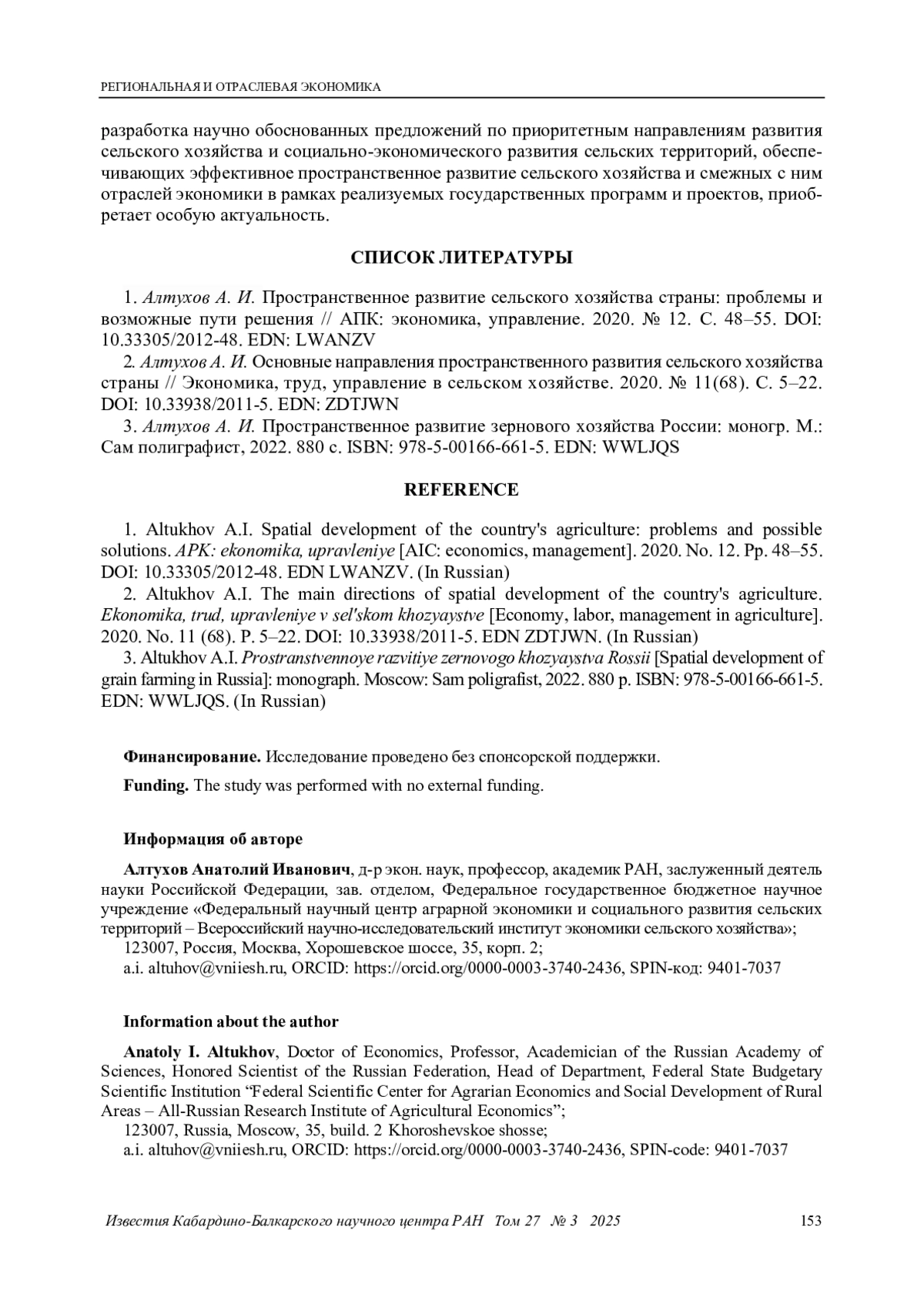 2. Алтухов А. И. Основные направления пространственного развития сельского хозяйства страны // Экономика, труд, управление в сельском хозяйстве. 2020. № 11(68). С. 5-22. DOI: 10.33938/2011-5 EDN: ZDTJWN