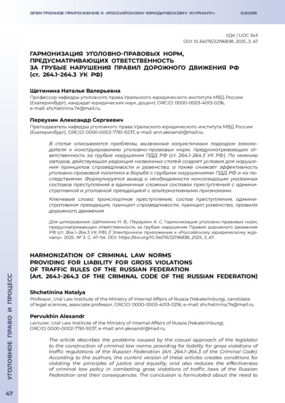 ЩЕТИНИНА Н. В., ПЕРВУХИН А. С. ГАРМОНИЗАЦИЯ УГОЛОВНО-ПРАВОВЫХ НОРМ, ПРЕДУСМАТРИВАЮЩИХ ОТВЕТСТВЕННОСТЬ ЗА ГРУБЫЕ НАРУШЕНИЯ ПРАВИЛ ДОРОЖНОГО ДВИЖЕНИЯ РФ (СТ. 264.1-264.3 УК РФ) // ЭЛЕКТРОННОЕ ПРИЛОЖЕНИЕ К РОССИЙСКОМУ ЮРИДИЧЕСКОМУ ЖУРНАЛУ. 2025. № 3