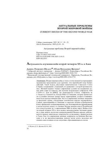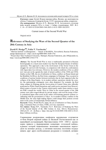 Вторая мировая война в Азии в отечественной историографии традиционно представлено куда скромнее, чем европейский театр боевых действий. Такой подход обусловлен вовлеченностью Советского Союза в борьбу за выживание с Германией, по сравнению с которой противостояние с Японией меркнет. Однако современные условия так называемых новых войн ставят на повестку дня изучение вооруженных конфликтов 1920 и 1930-х гг. (бои на КВЖД, эра милитаристов в Китае, конфликты на о. Хасан и р. Халхин-Гол, походы РККА в Синьцзян), которые происходили в условиях нечетких границ между территориями, де-факто появившимися после распада империи Цин. Как и в современных военных операциях за пределами страны, участвующие контингенты нередко маскировались. Скажем, красноармейцы в Синьцзяне и советские летчики в Центральном Китае официально позиционировались как белогвардейские формирования и могли получать оплату от союзных Москве центров силы в Поднебесной (что отчасти роднит их с современными ЧВК по всему миру). Войны в Китае второй четверти XX в. часто велись непосредственно частными армиями, и даже войска достаточно централизованной Японии нередко действовали по приказу квантунских генералов без согласования с правительством в Токио. Как и в современных военных конфликтах на Ближнем Востоке, одни и те же высокопоставленные деятели могли успеть несколько раз сменить свою позицию в ходе ситуативно образовывающихся союзов.