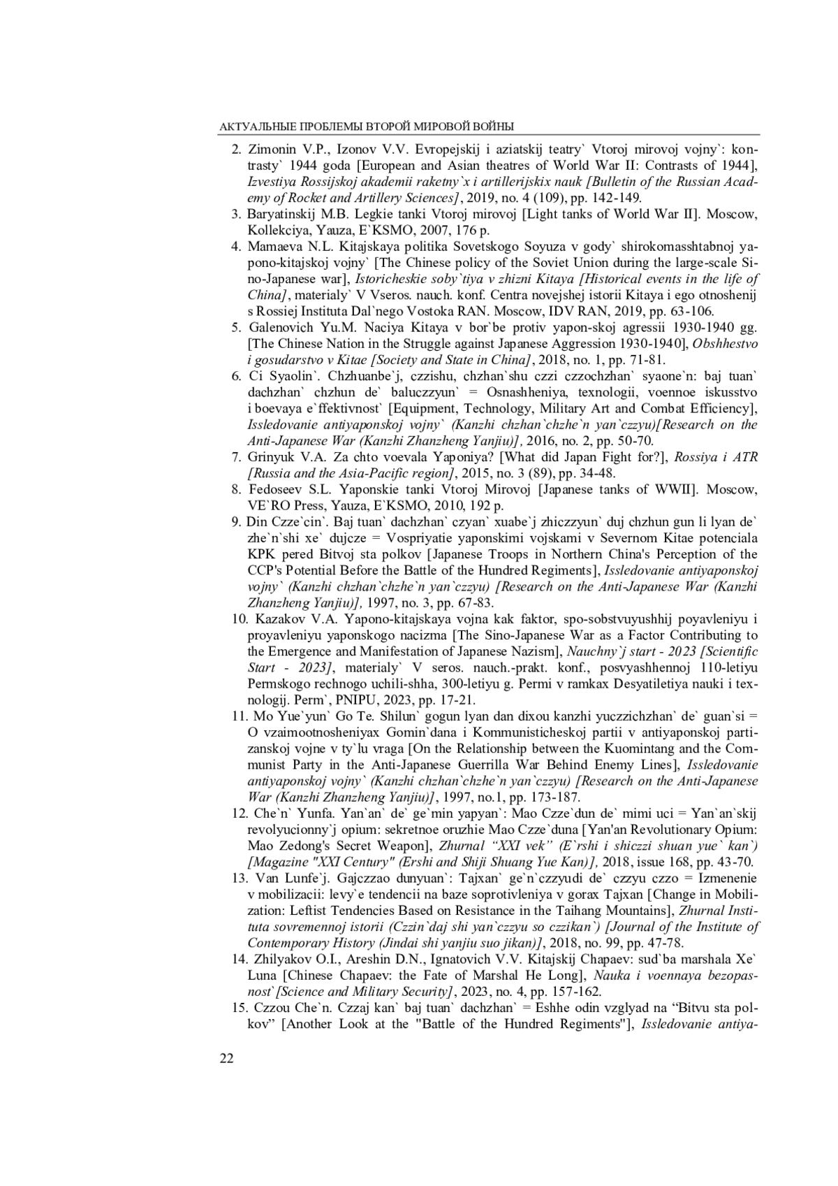 1. Жиляков О. И., Арешин Д. Н., Игнатович В. В. Об изменении оценок исторического значения сражений Японо-китайской войны 1937-1945 годов в КНР // Наука и военная безопасность. 2022. № 2 (29). С. 88-92.