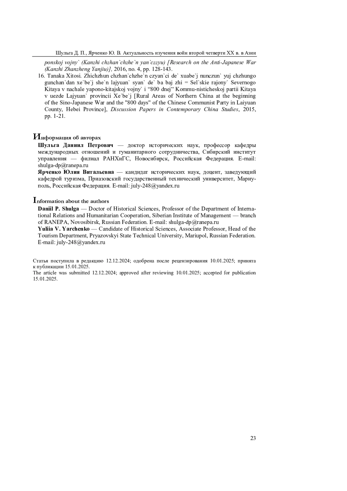 10. Казаков В. А. Японо-китайская война как фактор, способствующий появлению и проявлению японского нацизма // Научный старт - 2023: материалы Всерос. науч.-практ. конф., посвященной 110-летию Пермского речного училища, 300-летию г. Перми в рамках Десятилетия науки и технологий. Пермь: ПНИПУ, 2023. С. 17-21.