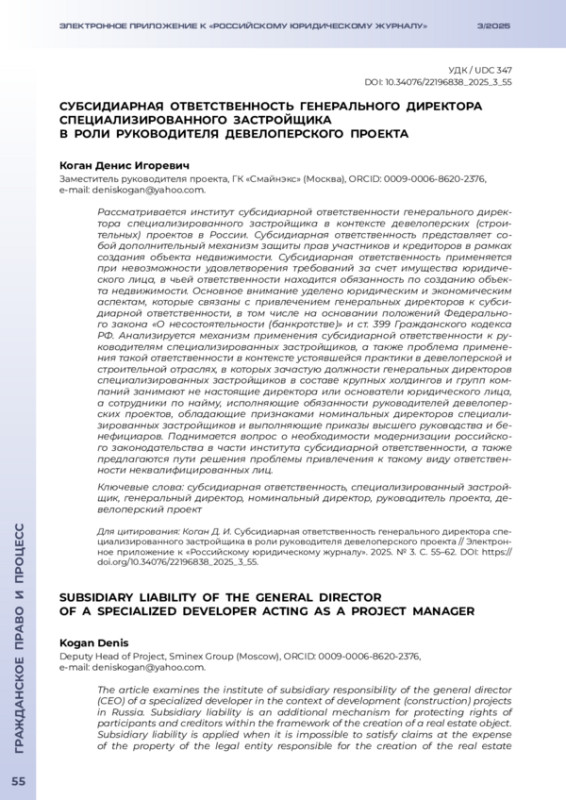 КОГАН Д. И. СУБСИДИАРНАЯ ОТВЕТСТВЕННОСТЬ ГЕНЕРАЛЬНОГО ДИРЕКТОРА СПЕЦИАЛИЗИРОВАННОГО ЗАСТРОЙЩИКА В РОЛИ РУКОВОДИТЕЛЯ ДЕВЕЛОПЕРСКОГО ПРОЕКТА // ЭЛЕКТРОННОЕ ПРИЛОЖЕНИЕ К РОССИЙСКОМУ ЮРИДИЧЕСКОМУ ЖУРНАЛУ. 2025. № 3