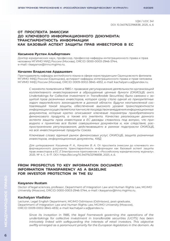 13. KasyanovR. A., Kachalyan V. A. Evolution of the Legal Framework for UCITS Funds in the European Union (1985-2023) // Kutafin Law Review. 2024. Vol. 11. № 2. P. 325-369. EDN: FMAKQF