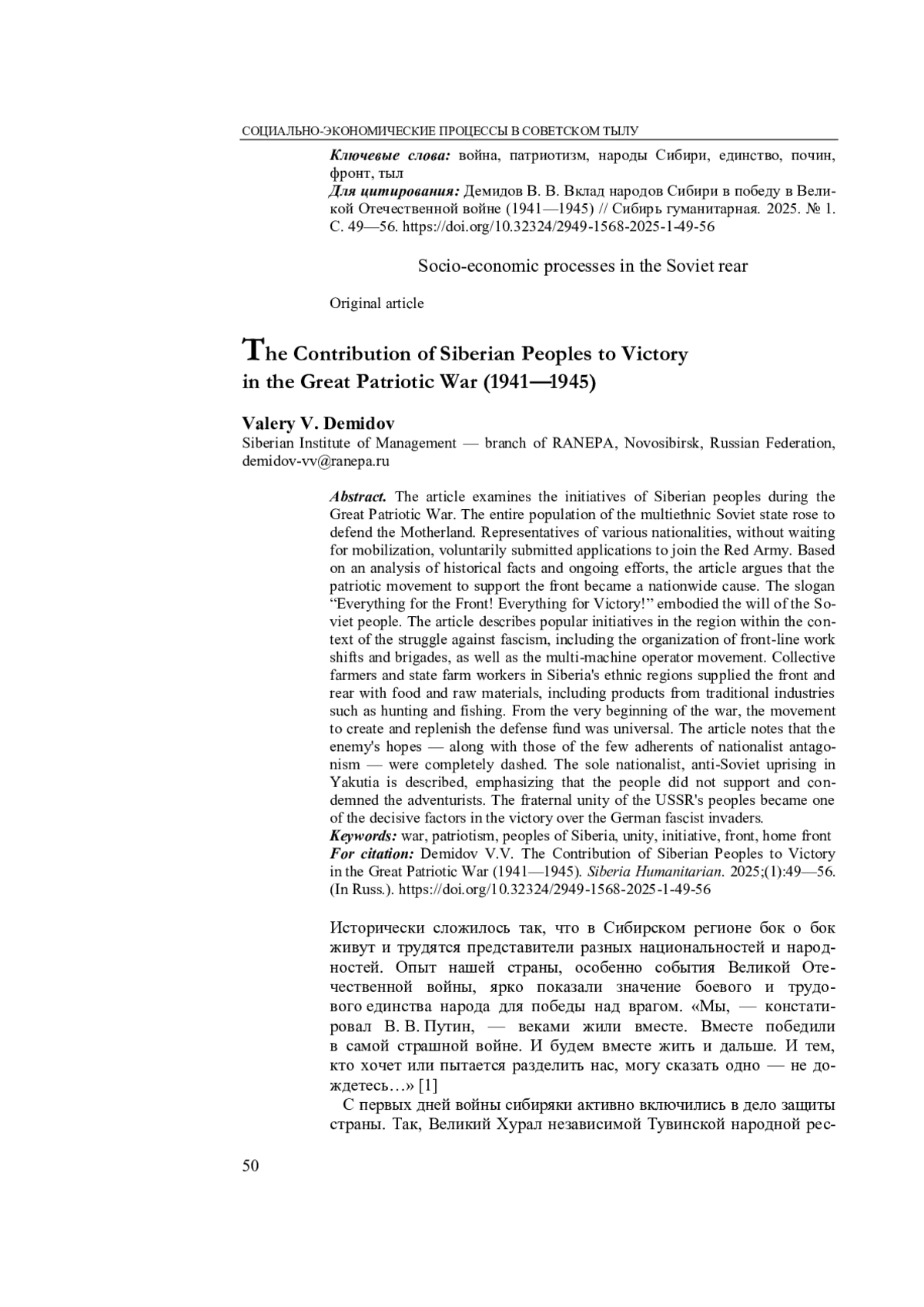 Статья посвящена инициативе народов Сибири в ходе Великой Отечественной войны. На защиту Родины поднялось все население многонационального советского государства. Представители разных национальностей, не дожидаясь мобилизации, добровольно подавали заявления о зачислении их в ряды Красной армии. На основе анализа исторических фактов и проводимых мероприятий утверждается, что патриотическое движение в помощь фронту стало всенародным делом. Выдвинутый лозунг «Все для фронта! Все для победы!» стал выражением воли советских людей. Описываются народные инициативы в регионе в контексте курса на победу над фашизмом (организация фронтовых смен и бригад, движение многостаночников). Колхозники и работники совхозов национальных рай-онов Сибири обеспечивали фронт и тыл продовольствием и сырьем, в том числе продукцией таких традиционных промыслов, как охота и рыболовство. Всеобщий характер с самого начала войны носило движение за создание и пополнение фонда обороны. Констатируется, что надежды врага и немногочисленных приверженцев курса на национальный антагонизм потерпели полный провал. Описывается единственное националистическое антисоветское выступление, произошедшее в Якутии. Подчеркивается, что народ не поддержал и осудил авантюристов. Братское содружество народов СССР стало одним из решающих факторов победы над немецко-фашистскими захватчиками.