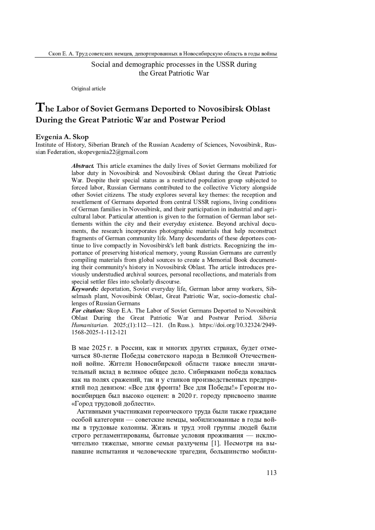 В статье освещена повседневная жизнь советских немцев, мобилизованных для трудовой повинности в годы Великой Отечественной войны, в Новосибирске и Новосибирской области. Несмотря на особый статус данной категории граждан и принудительный труд, российские немцы вносили свой вклад в общую Победу над врагом наряду с другими жителями страны. К числу основных тем, затронутых автором, относится прием и размещение депортированных немцев из центральной части СССР, бытовые условия немецких семей в Новосибирске, их участие в производственной и трудовой деятельности. Уделяется внимание процессу формирования немецких трудовых поселков в черте города и повседневной жизни в них. Помимо архивных документов, используются фотоматериалы, позволяющие реконструировать отдельные фрагменты жизни немцев. В лево-бережной части Новосибирска до настоящего времени компактно проживают многие их потомки. Понимая важность сохранения исторической памяти о судьбах своих предков, молодые российские немцы в настоящее время ведут работу по поиску, сбору и систематизации материалов из разных географических точек мира для создания Книги памяти немцев Новосибирской области. В научный оборот вводятся малоизвестные архивные источники, воспоминания немцев и иные материалы из личных дел немцев-спецпоселенцев.