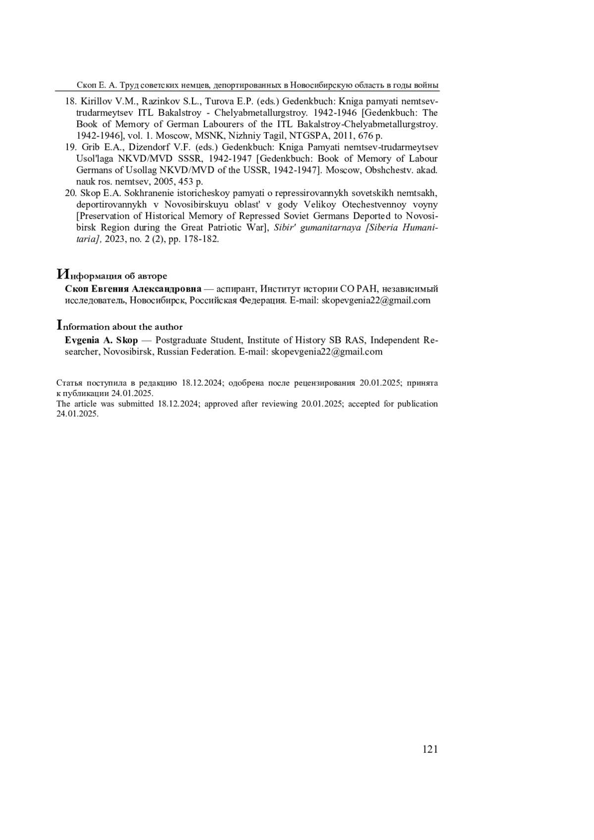20. Скоп Е. А. Сохранение исторической памяти о репрессированных советских немцах, депортированных в Новосибирскую область в годы Великой Отечественной войны // Сибирь гуманитарная. 2023. № 2 (2). С. 178-182.