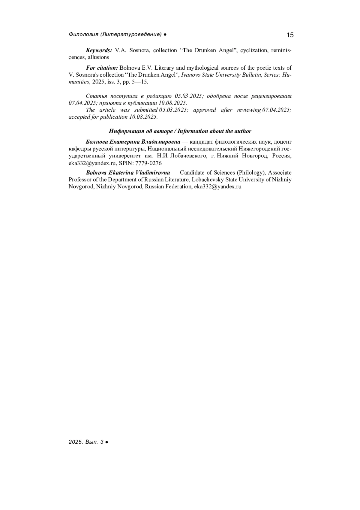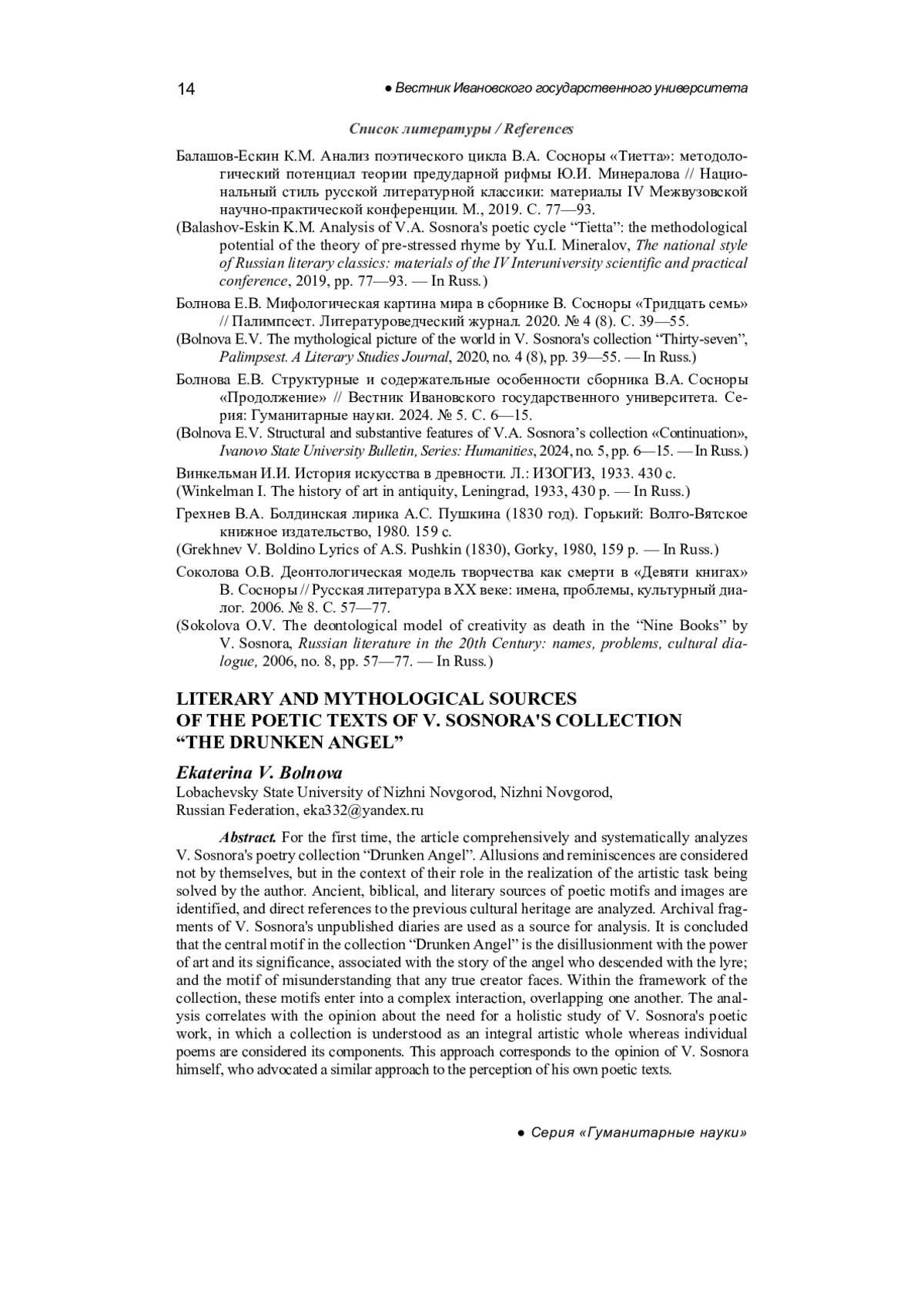 БОЛНОВА Е. В. ЛИТЕРАТУРНЫЕ И МИФОЛОГИЧЕСКИЕ ИСТОЧНИКИ ПОЭТИЧЕСКИХ ТЕКСТОВ СБОРНИКА В. СОСНОРЫ «ПЬЯНЫЙ АНГЕЛ» // ВЕСТНИК ИВАНОВСКОГО ГОСУДАРСТВЕННОГО УНИВЕРСИТЕТА. СЕРИЯ: ГУМАНИТАРНЫЕ НАУКИ. 2025. № 3
