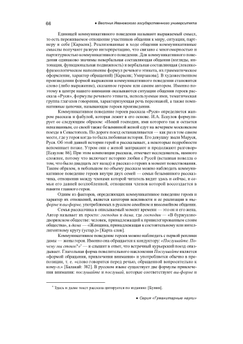 Многократно исследованный и описанный в научной литературе рассказ «Руся» получает разную интерпретацию содержания и вложенных в него смыслов, что обусловлено социальными запросами времени, факторами идеологического и биографического планов, различием аспектов собственно филологического анализа. Эти подходы позволяют рассматривать рассказ как феномен русской культуры. Обращение к анализу коммуникативного поведения героев рассказа нацелено на объективную интерпретацию характера героев, осмысление их отношений, авторский взгляд на рассказанную историю, а также скрытый в ней смысл. Коммуникативное поведение человека обусловлено существующими у народа традициями общения. Оно строится с учетом ситуации общения, возрастных особенностей коммуникантов, гендерной составляющей и т. д. В художественном произведении коммуникативное поведение описывается через слово либо оборот речи, сказанные героем или самим автором. При этом писатель в равной мере обращает внимание на невербальную составляющую общения (взгляды, интонацию, функциональную подвижность), на вербальную составляющую (лексико-фразеологическое наполнение формул речевого этикета, их грамматическое оформление, характер обращен ий), а также на феномен молчания. Именно поэтому в центре внимания оказались ситуации общения героев рассказа «Руся», дистанция их общения, формулы речевого этикета, используемые ими, тематическая группа глаголов говорения, характеризующая речь персонажей, а также номинативные цепочки, называющие героев произведения. Анализ перечисленных материалов позволил дать новую интерпретацию содержания рассказа, который оказался актуальным для современных реалий.