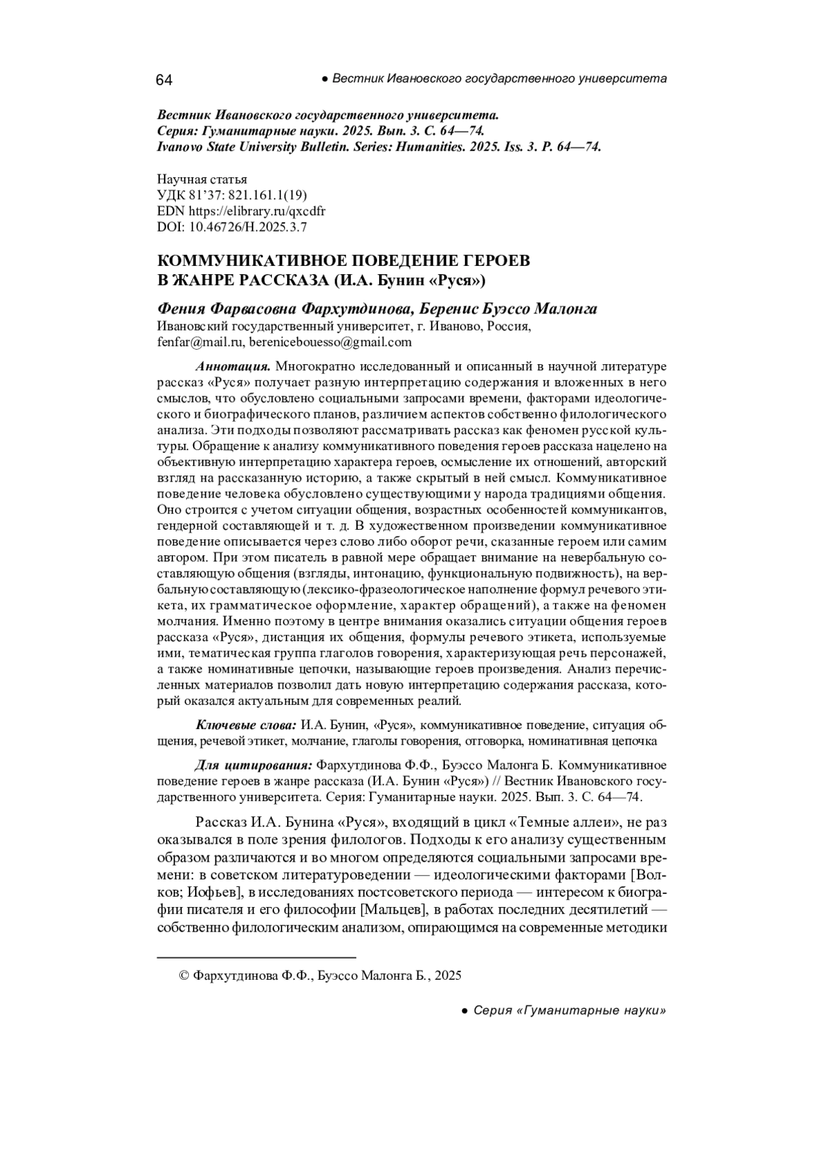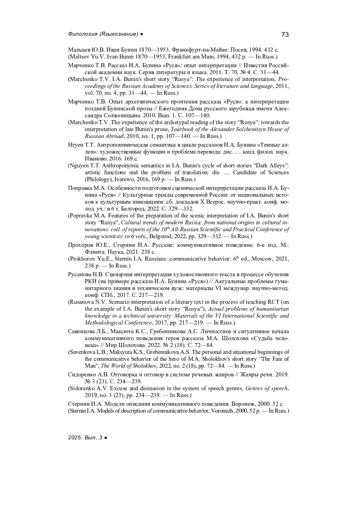 Marchenko T.V. I.A. Bunin’s short story “Rusya”: The experience of interpretation, Proceedings of the Russian Academy of Sciences. Series of literature and language, 2011, vol. 70, no. 4, pp. 31-44. - In Russ.