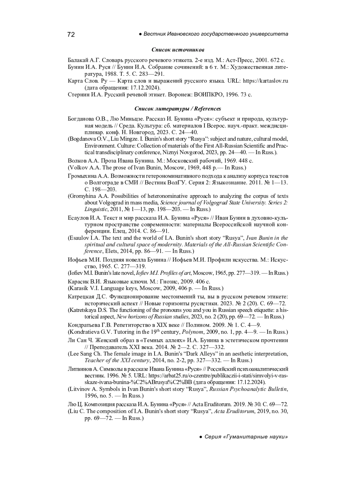 5. Богданова О.В., Лю Миньцзе. Рассказ И. Бунина “Руся”: субъект и природа, культурная модель // Среда. Культура: сб. материалов I Всерос. науч.-практ. междисциплинар. конф. Н. Новгород, 2023. С. 24-40. EDN: DDGUVT