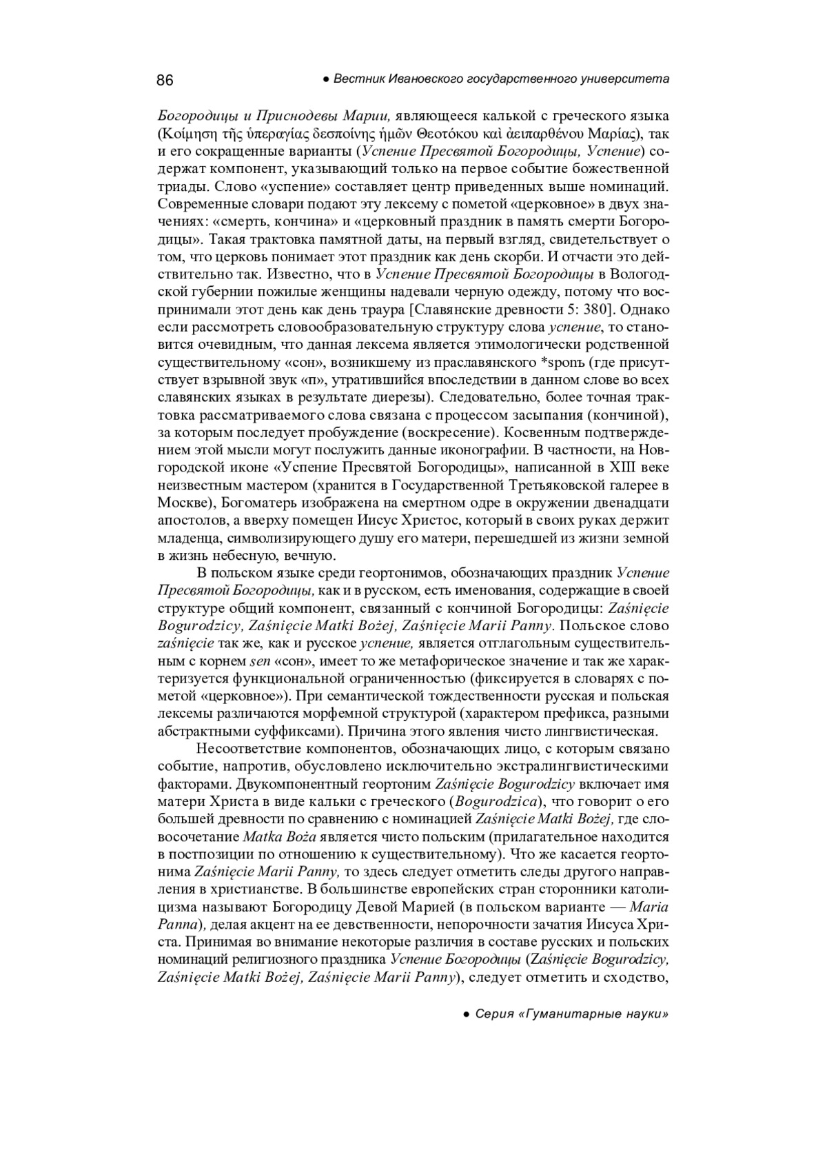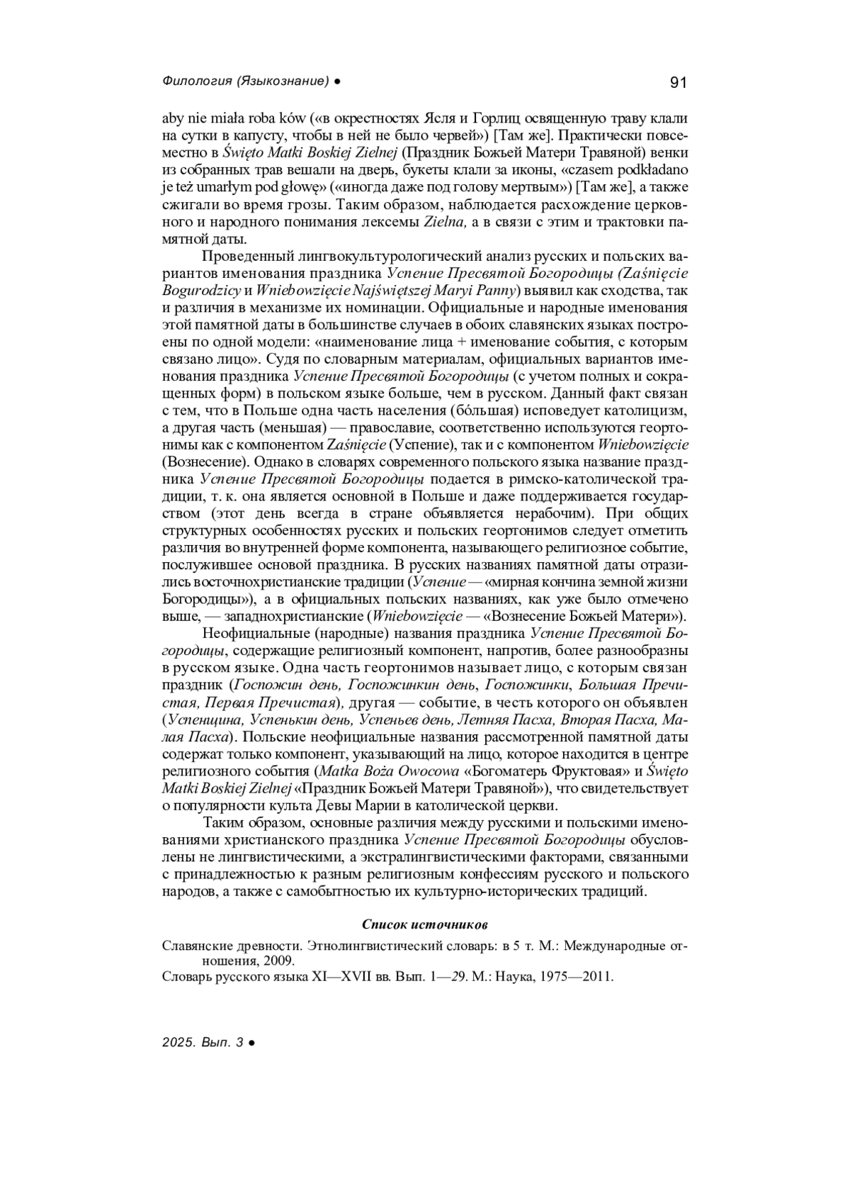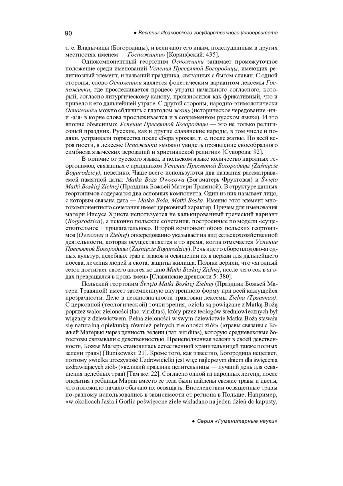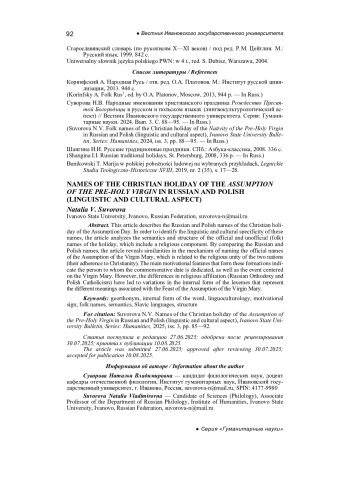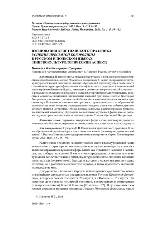 Suvorova N.V. Folk names of the Christian holiday of the Nativity of the Pre-Holy Virgin in Russian and Polish (linguistic and cultural aspect), Ivanovo State University Bulletin, Series: Humanities, 2024, iss. 3, pp. 88-95. - In Russ.