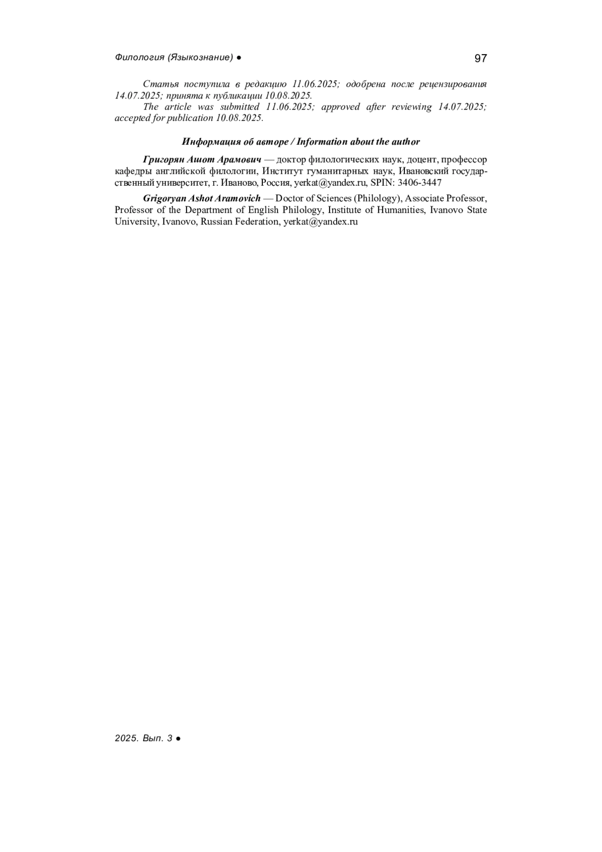 Статья посвящена исследованию лингвистических средств выражения экспрессивности высказываний-реплик англоязычного диалогического художественного дискурса. Материалом исследования послужил детективный роман «Урожай смертей» Каролин Уокер. В статье приведены определения понятий «дискурс», «художественный дискурс», «диалог» и «высказывание-реплика». Проведен анализ высказываний-реплик англоязычного художественного диалога, выделены анализируемые лингвистические средства выражения экспрессивности и выявлены прагматические функции исследуемых языковых средств в высказываниях-репликах коммуникантов. Цель работы — исследование лингвистических средств выражения экспрессивности высказываний-реплик англоязычного диалогического художественного дискурса, а также их прагматических особенностей на всех уровнях языковой иерархии. В результате анализа высказываний-реплик диалога автор приходит к выводу, что на лексическомуровне в диалоге преобладают сокращенные слова, бранные слова и их эвфемизмы, усилители-интенсификаторы, междометия и междометные выражения, вводные слова, фразы, этикетные формулы и др. Перечисленные языковые средства способствуют успешной коммуникации, естественному звучанию диалога, его эмоциональной нагрузке. Высказывания-реплики диалога характеризуются следующими морфологическими особенностями: в них преобладают местоимения первого и второго лица, сокращения, стяженные глагольные формы, аналитические эмфатические формы, фразовые глаголы, глагольные сочетания и др. Среди синтаксических характеристик высказываний-реплик автор выделяет: односоставные предложения, связанные в диалогические единства; эллиптические обороты и предложения; вопросы в синтаксической форме утвердительного предложения; конструкции сослагательного наклонения и др. Автор статьи приходит к заключению, что англоязычный художественный диалог состоит из высказываний-реплик, характеризующихся специфическими лингвистическими особенностями, реализующими прагматическую функцию высказываний-реплик его участников.