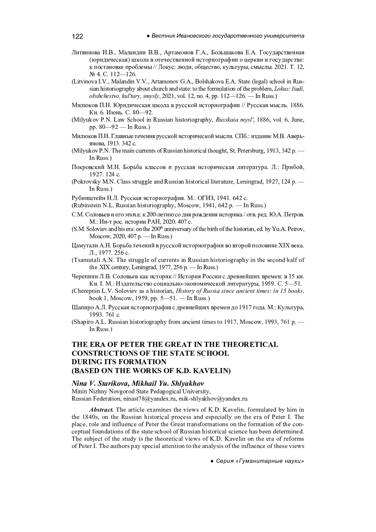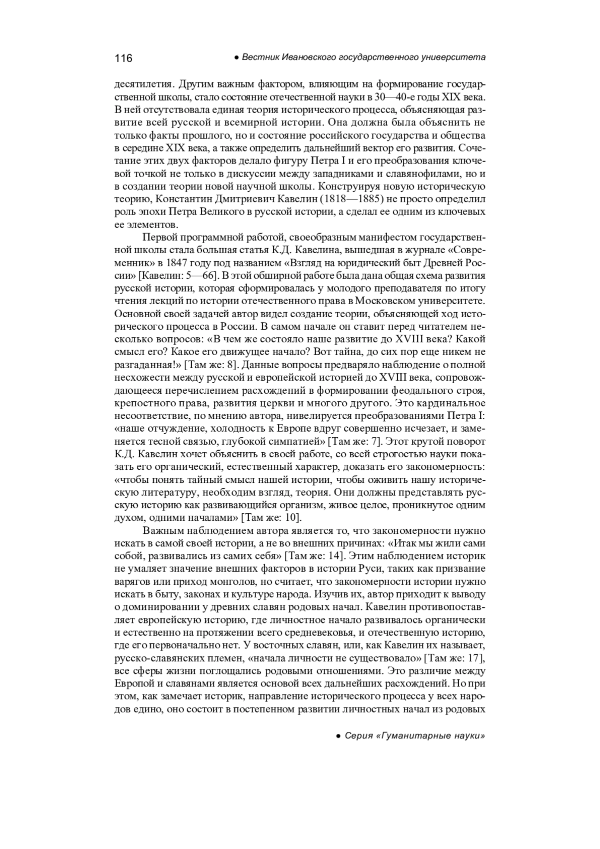 СТАРИКОВА Н. В., ШЛЯХОВ М. Ю. ЭПОХА ПЕТРА I В ТЕОРЕТИЧЕСКИХ ПОСТРОЕНИЯХ ГОСУДАРСТВЕННОЙ ШКОЛЫ В ПЕРИОД ЕЕ ФОРМИРОВАНИЯ (НА МАТЕРИАЛЕ РАБОТ К. Д. КАВЕЛИНА) // ВЕСТНИК ИВАНОВСКОГО ГОСУДАРСТВЕННОГО УНИВЕРСИТЕТА. СЕРИЯ: ГУМАНИТАРНЫЕ НАУКИ. 2025. № 3