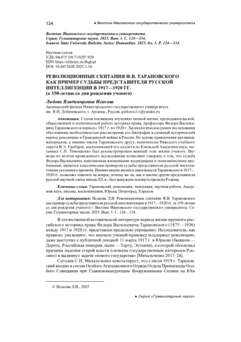 Статья посвящена изучению личной жизни, преподавательской, общественной и политической работе историка права, профессора Федора Васильевича Тарановского в период с 1917 г. по 1920 г. Хронологические рамки исследования обусловлены необходимостью рассмотрения его биографии в сложный исторический период революции и Гражданской войны в России. На основе привлечения архивных материалов, а именно писем Тарановского другу, попечителю Рижского учебного округа В. Э. Грабарю, воспоминаний его коллеги по Киевской Акаде мии наук, механика С. П. Тимошенко был реконструирован важный этап жизни ученого. Выводы по итогам проведенного исследования позволяют говорить о том, что судьба Федора Васильевича, наполненная жизненными неурядицами и экономическими проблемами, является классическим примером судьбы представителя русской интеллигенции указанного времени. Именно анализ жизни и деятельности Тарановского в 1917— 1920 гг. позволяет ответить на вопрос, почему же он, как и многие другие представители русской научной элиты начала ХХ в., был вынужден покинуть пределы Родины