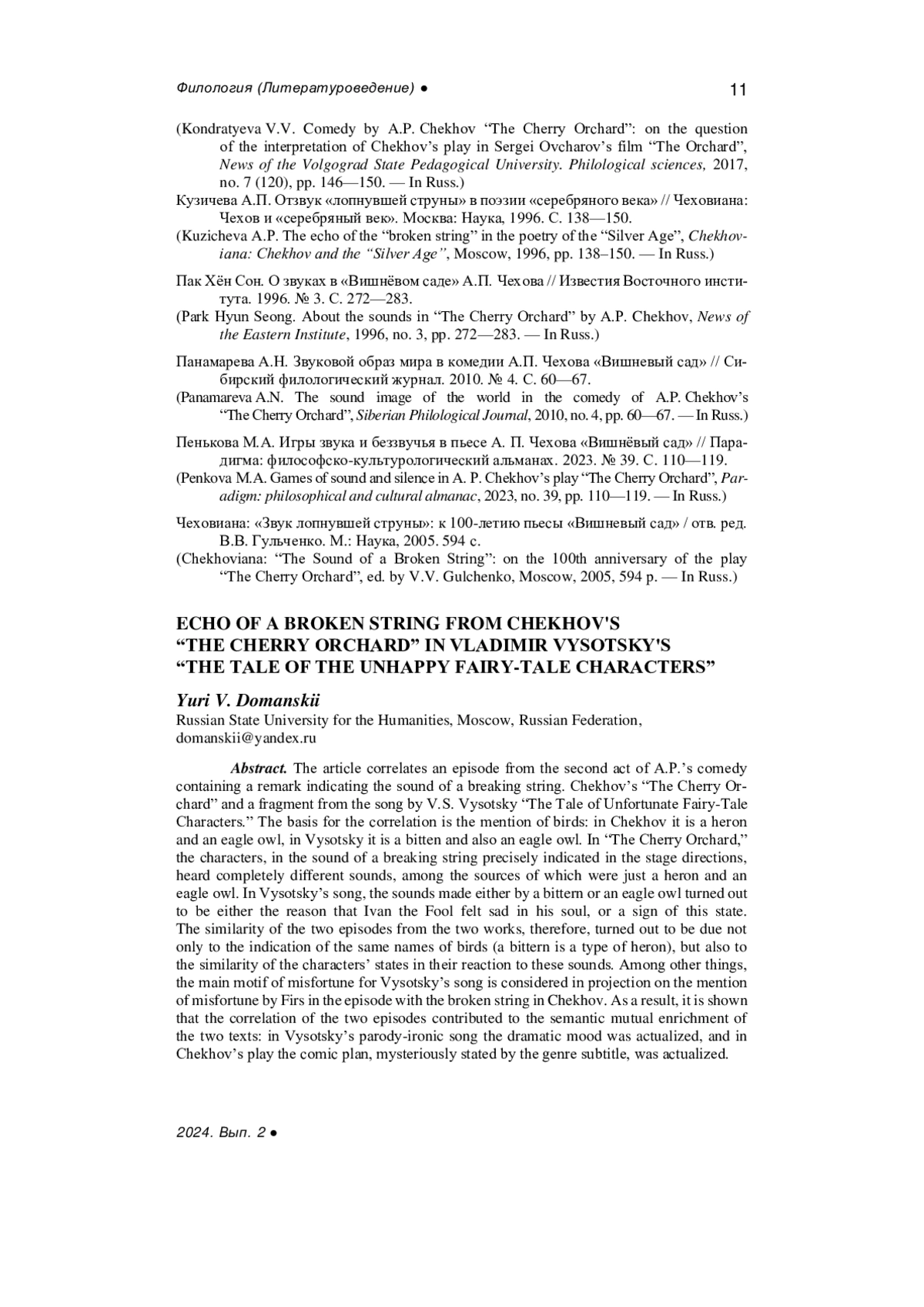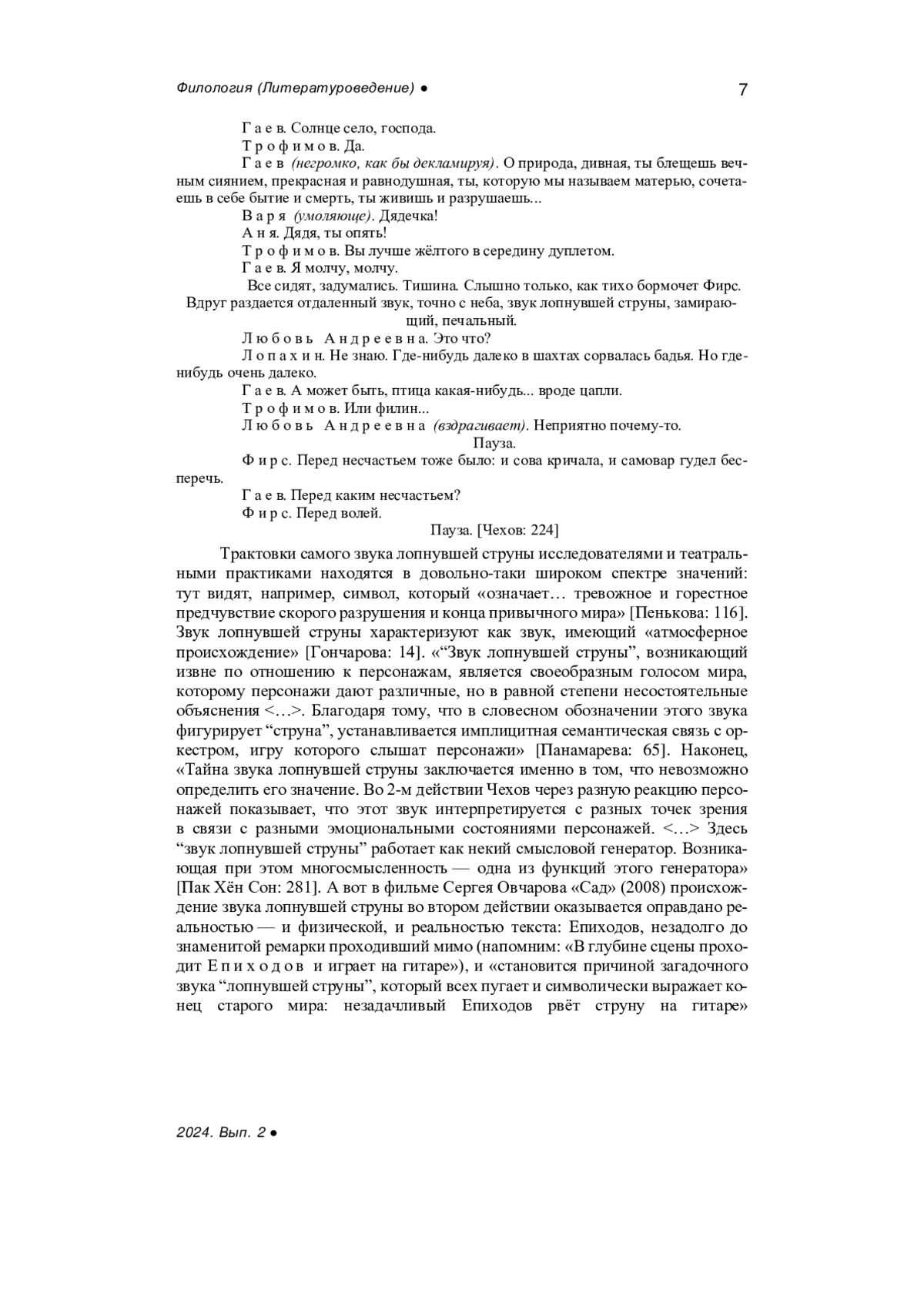 11. Пенькова М.А. Игры звука и беззвучья в пьесе А. П. Чехова “Вишнёвый сад” // Парадигма: философско-культурологический альманах. 2023. № 39. С. 110-119. EDN: AXUTOV