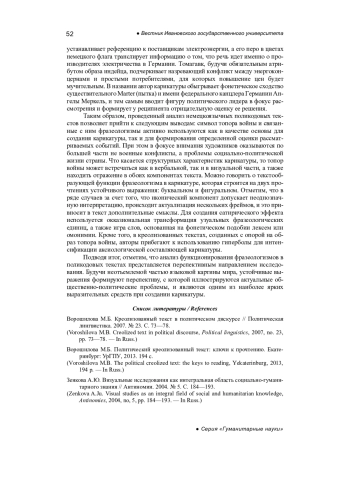 2. Ворошилова М.Б. Политический креолизованный текст: ключи к прочтению. Екатеринбург: УрГПУ, 2013. 194 с. EDN: QIRMSX