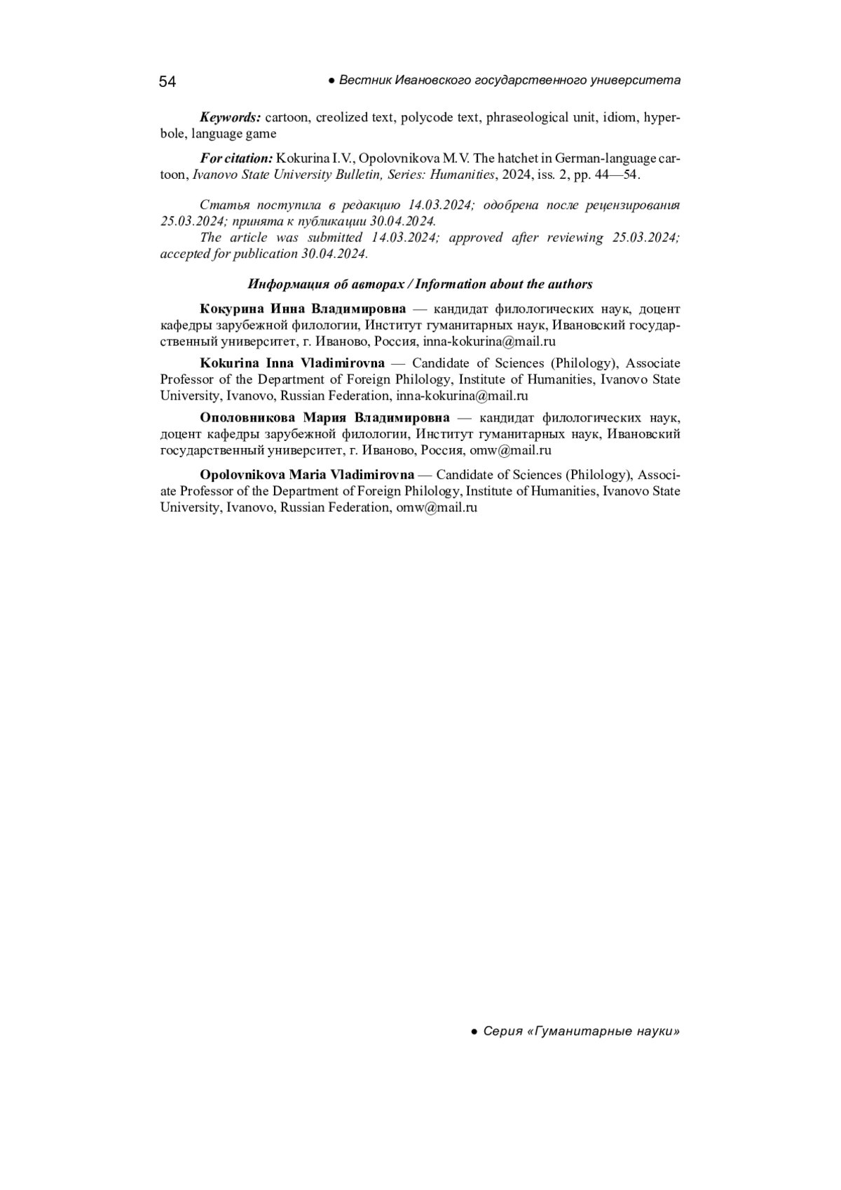 5. Ополовникова М.В., Кокурина И.В. Функции логических частиц в креолизованном тексте (на материале современной карикатуры) // Ученые записки Петрозаводского государственного университета. 2021. Т. 43, № 5. С. 48-57. EDN: MYVDEE