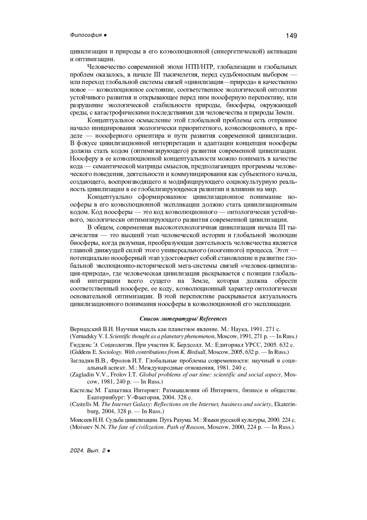 Moiseev N.N. The fate of civilization. Path of Reason, Moscow, 2000, 224 p. - In Russ.