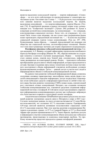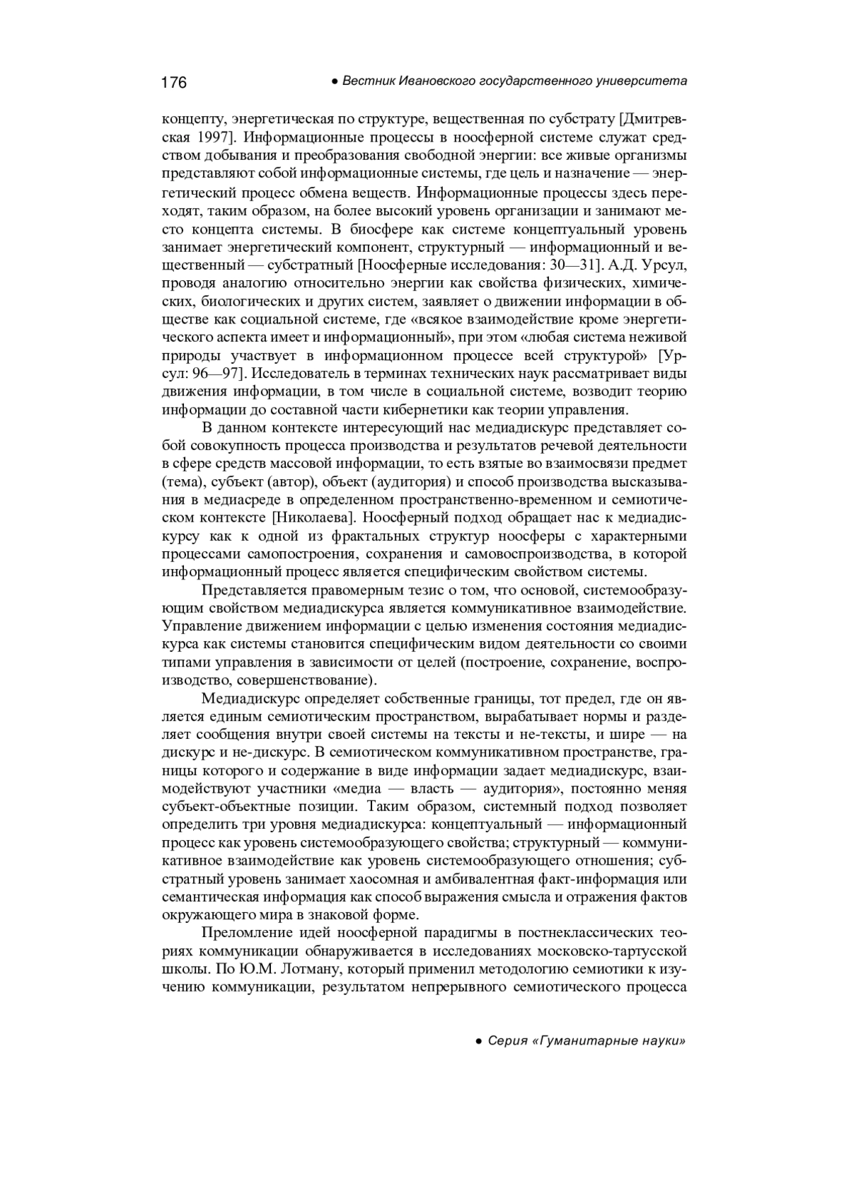 Медиадискурс как структурный элемент ноосферы. Основополагающие идеи В. И. Вернадского о ноосфере изложены во многих трудах ученогофилософа, который сделал предметом научного поиска биогеохимический круговорот вещества и энергии в биосфере, а во втором биогеохимическом принципе дал решение проблемы направления развития органического мира и критериев прогресса. Логика развития человечества по Вернадскому — это коэволюция человека и биосферы, переход к новому состоянию биосферы — ноосфере. Движение философской мысли отечественной школы (Н. Н. Моисеев, И. Б. Новик, И. В. Дмитревская, А. И. Уёмов, Г. С. Смирнов и др.) идет от принципа автотрофности человечества к экологическому благополучию и самообеспечению, новому единству природы и общества на более высоком уровне, к анализу логического содержания понятий «ноосфера», «социосфера», «антропосфера», «техносфера»