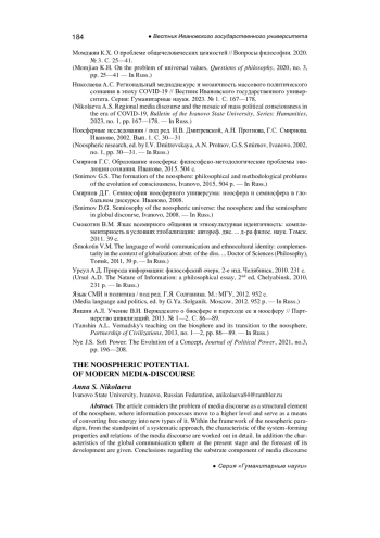 11. Смирнов Д.Г. Семиософия ноосферного универсума: ноосфера и семиосфера в глобальном дискурсе. Иваново, 2008. EDN: QWUEDJ