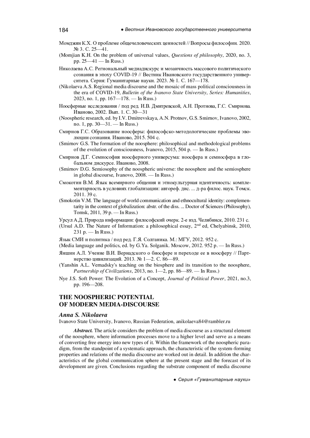 8. Николаева А.С. Региональный медиадискурс и мозаичность массового политического сознания в эпоху COVID-19 // Вестник Ивановского государственного университета. Серия: Гуманитарные науки. 2023. № 1. С. 167-178. EDN: QWTWHE