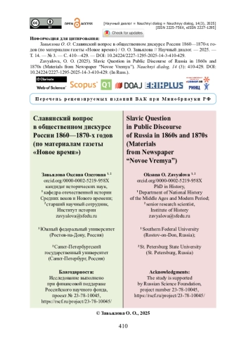 18. Федорова Е. Ю. Славянский вопрос и русский национализм в либеральной публицистике 1860-х гг. / Е. Ю. Федорова // Вестник Российского университета дружбы народов. Серия : История России. - 2013. - № 3. - С. 55-65.