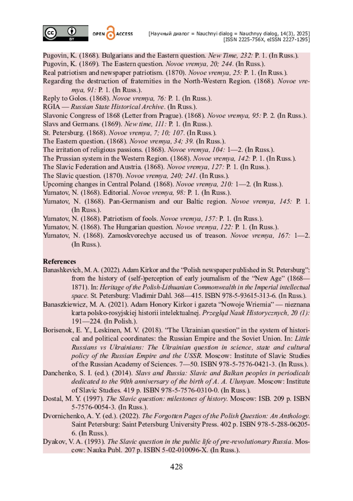 19. Banaszkiewicz M. A. Adam Honory Kirkor i gazeta “Nowoje Wriemia” - nieznana karta polsko-rosyjskiej historii intelektualnej / M. A. Banaszkiewicz, A. E. Kotov // Przegląd Nauk Historycznych. - 2021. - T. 20. - № 1. - S. 191-224.