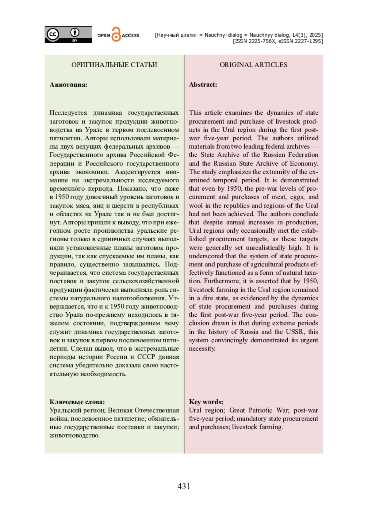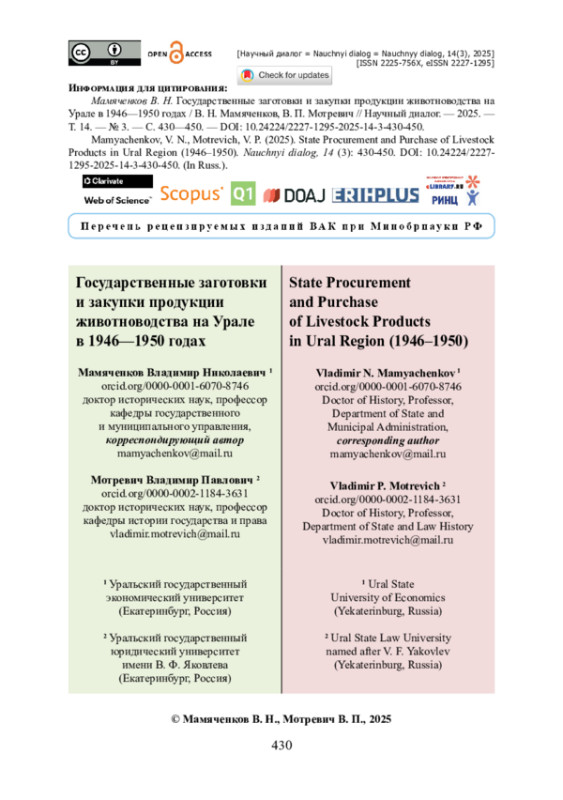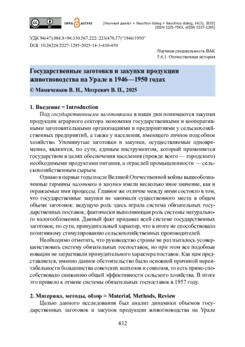 Исследуется динамика государственных заготовок и закупок продукции животноводства на Урале в первом послевоенном пятилетии. Авторы использовали материалы двух ведущих федеральных архивов — Государственного архива Российской Федерации и Российского государственного архива экономики. Акцентируется внимание на экстремальности исследуемого временно̀го периода. Показано, что даже в 1950 году довоенный уровень заготовок и закупок мяса, яиц и шерсти в республиках и областях на Урале так и не был достигнут. Авторы пришли к выводу, что при ежегодном росте производства уральские регионы только в единичных случаях выполняли установленные планы заготовок продукции, так как спускаемые им планы, как правило, существенно завышались. Подчеркивается, что система государственных поставок и закупок сельскохозяйственной продукции фактически выполняла роль системы натурального налогообложения. Утверждается, что и к 1950 году животноводство Урала по-прежнему находилось в тяжелом состоянии, подтверждением чему служит динамика государственных заготовок и закупок в первом послевоенном пятилетии. Сделан вывод, что в экстремальные периоды истории России и СССР данная система убедительно доказала свою настоятельную необходимость.