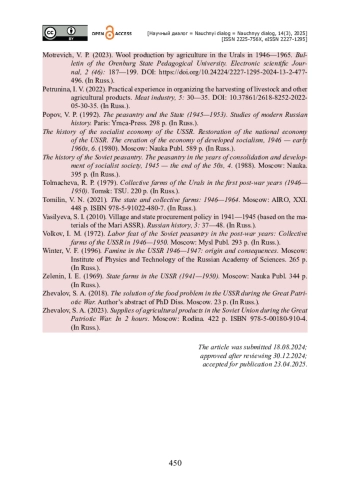 20. Мотревич В. П. Производство шерсти сельским хозяйством Урала в 1946-1965 гг. / В. П. Мотревич, В. Н. Мамяченков // Вестник Оренбургского государственного педагогического университета. Электронный научный журнал. - 2023. - № 2 (46). - С. 187-199. - https://doi.org/10.24224/2227-1295-2024-13-2-477-496.