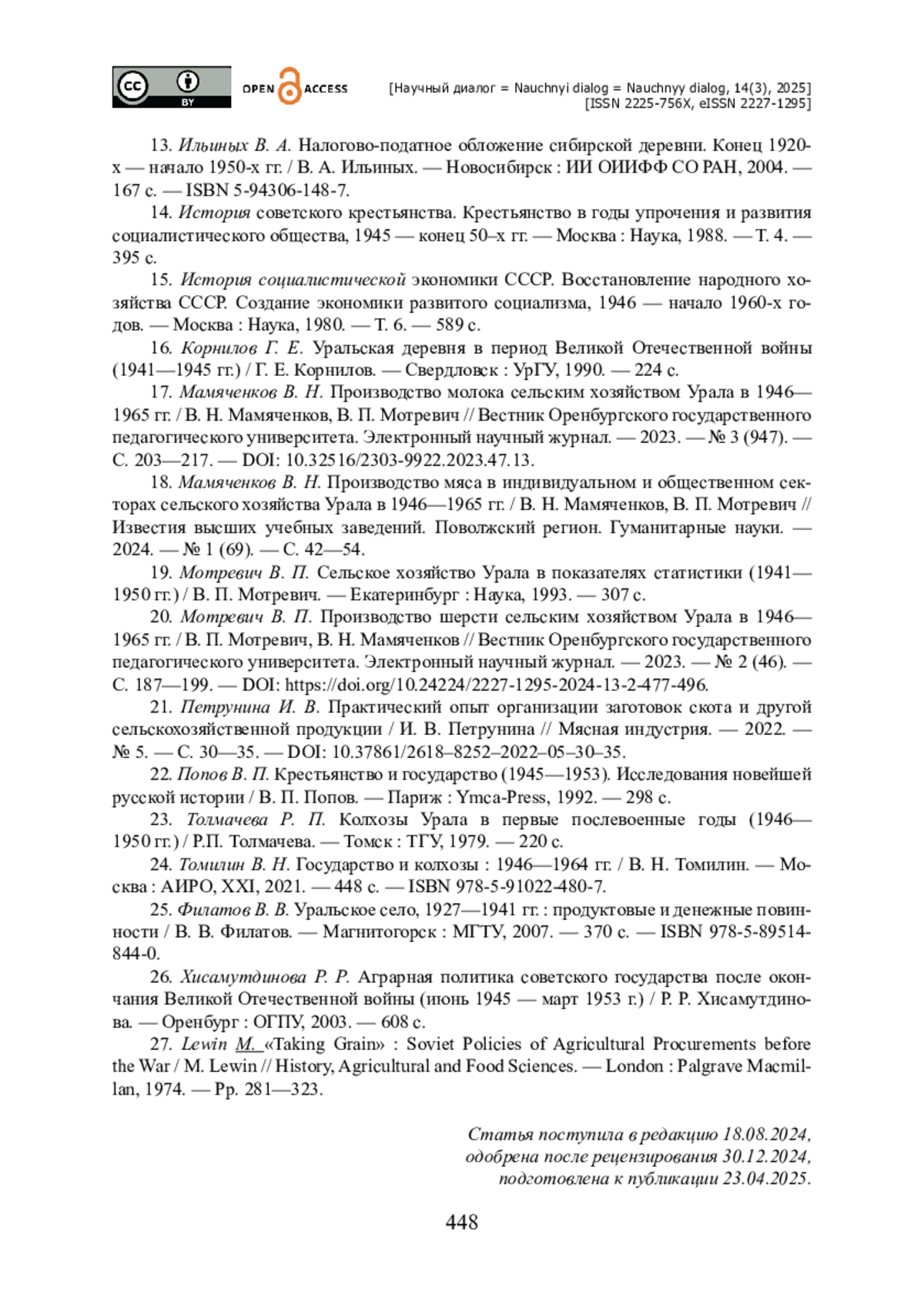 24. Томилин В. Н. Государство и колхозы : 1946-1964 гг. / В. Н. Томилин. - Москва : АИРО, XXI, 2021. - 448 с. - ISBN 978-5-91022-480-7.