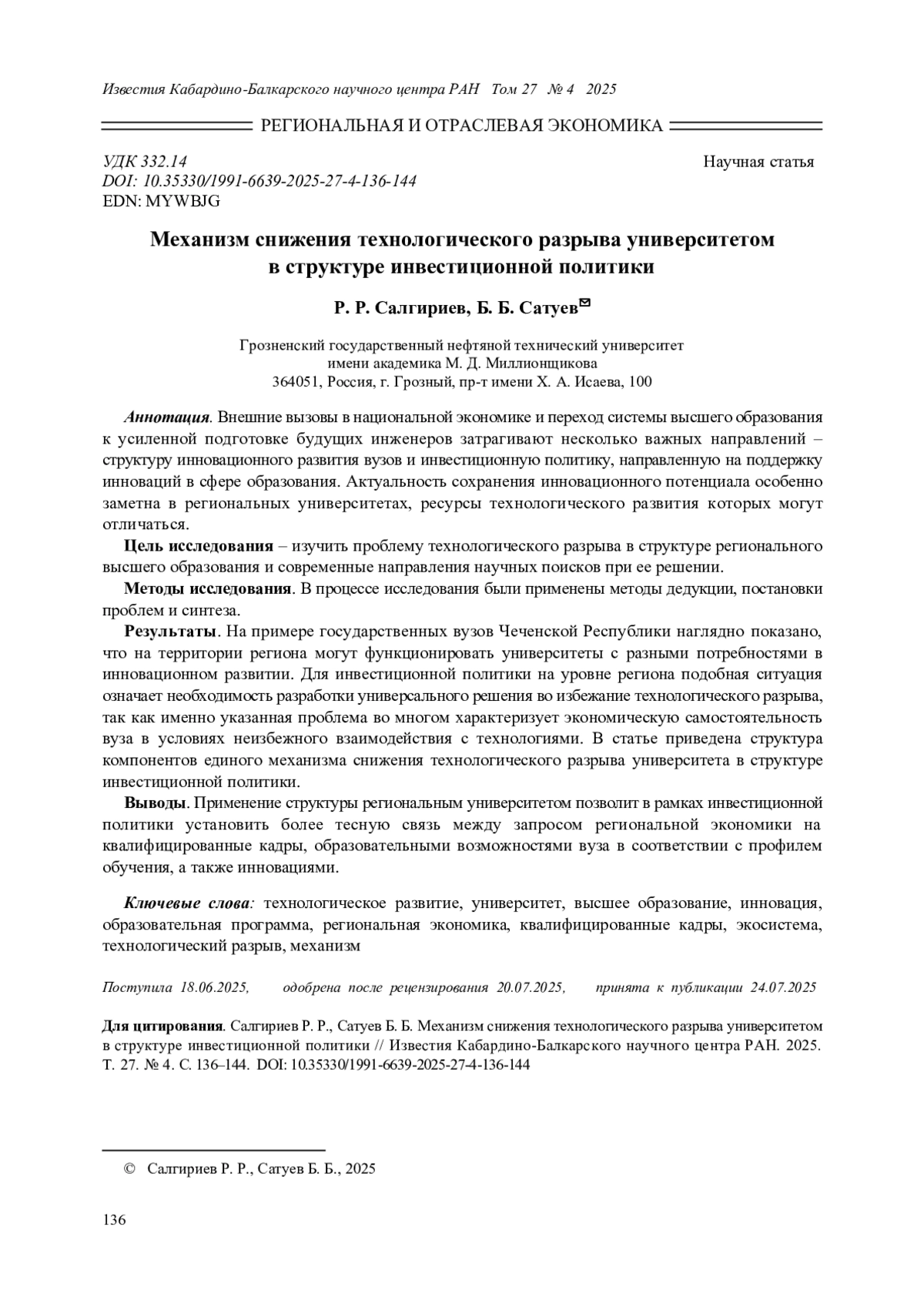 Результаты. На примере государственных вузов Чеченской Республики наглядно показано, что на территории региона могут функционировать университеты с разными потребностями в инновационном развитии. Для инвестиционной политики на уровне региона подобная ситуация означает необходимость разработки универсального решения во избежание технологического разрыва, так как именно указанная проблема во многом характеризует экономическую самостоятельность вуза в условиях неизбежного взаимодействия с технологиями. В статье приведена структура компонентов единого механизма снижения технологического разрыва университета в структуре инвестиционной политики.