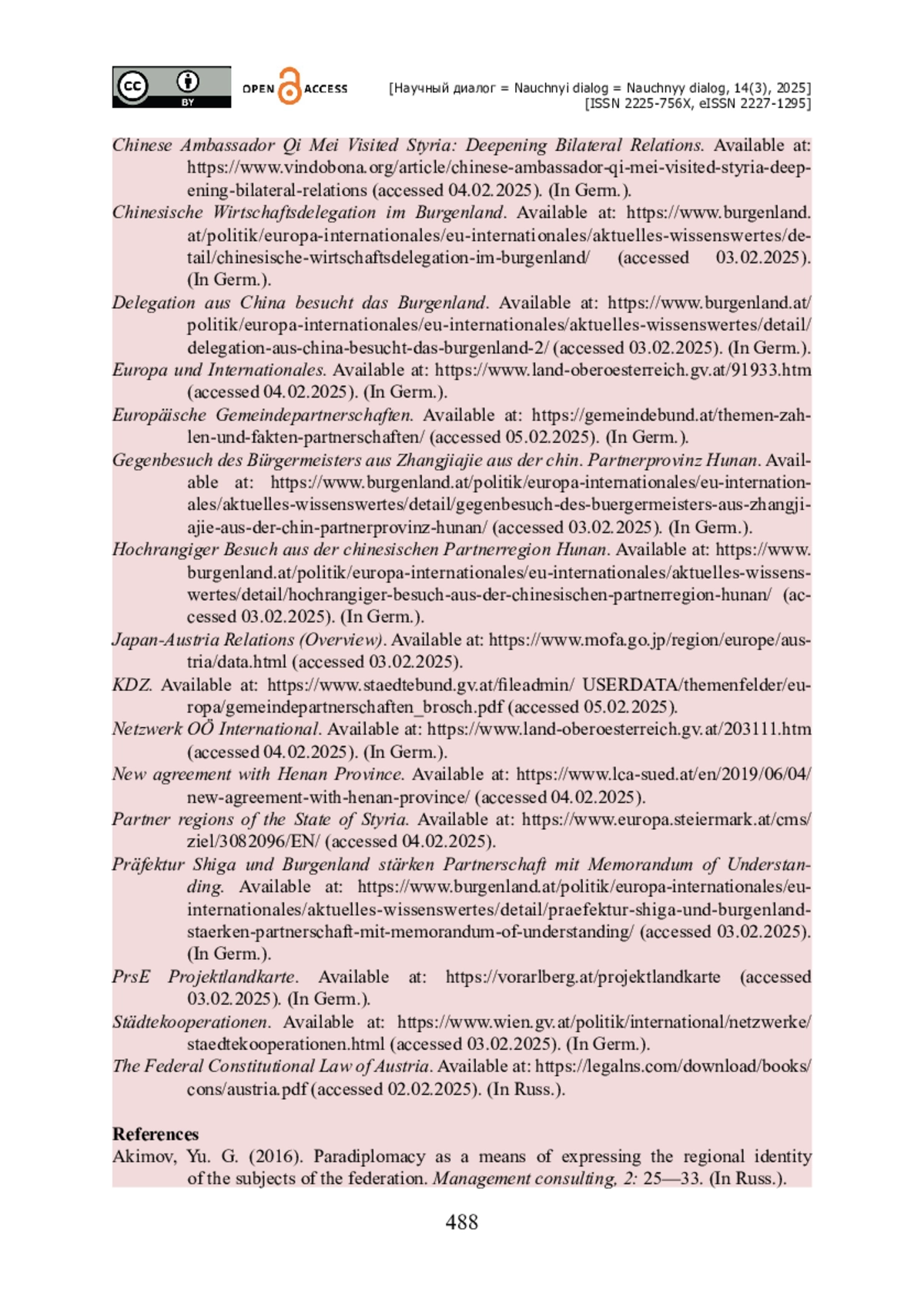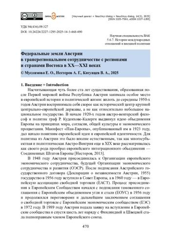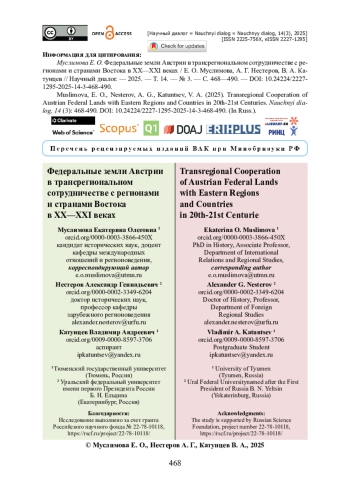 МУСЛИМОВА Е. О., НЕСТЕРОВ А. Г., КАТУНЦЕВ В. А. ФЕДЕРАЛЬНЫЕ ЗЕМЛИ АВСТРИИ В ТРАНСРЕГИОНАЛЬНОМ СОТРУДНИЧЕСТВЕ С РЕГИОНАМИ И СТРАНАМИ ВОСТОКА В XX—XXI ВЕКАХ // НАУЧНЫЙ ДИАЛОГ. 2025. ТОМ 14, № 3